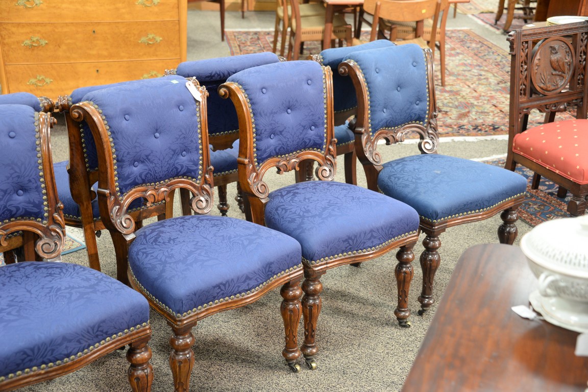 Lot 203: Set of twelve walnut Victorian side chairs having upholstered backs and seats on carved legs. height 33 inches