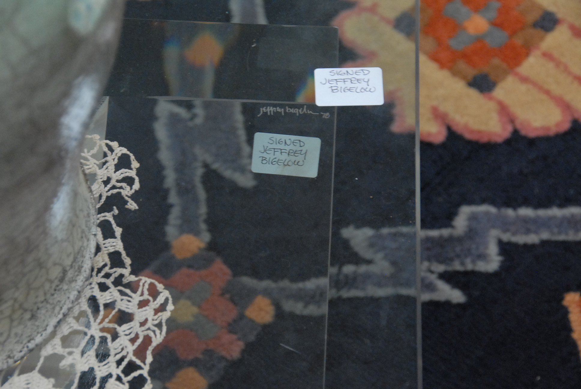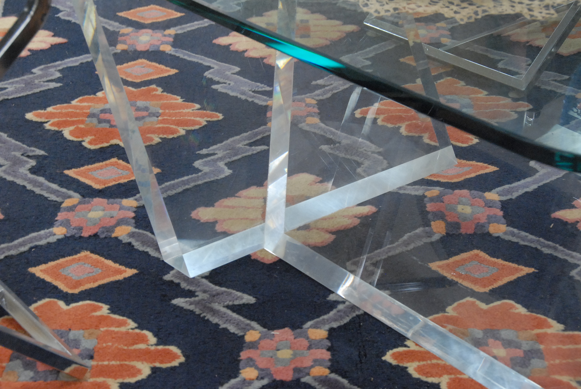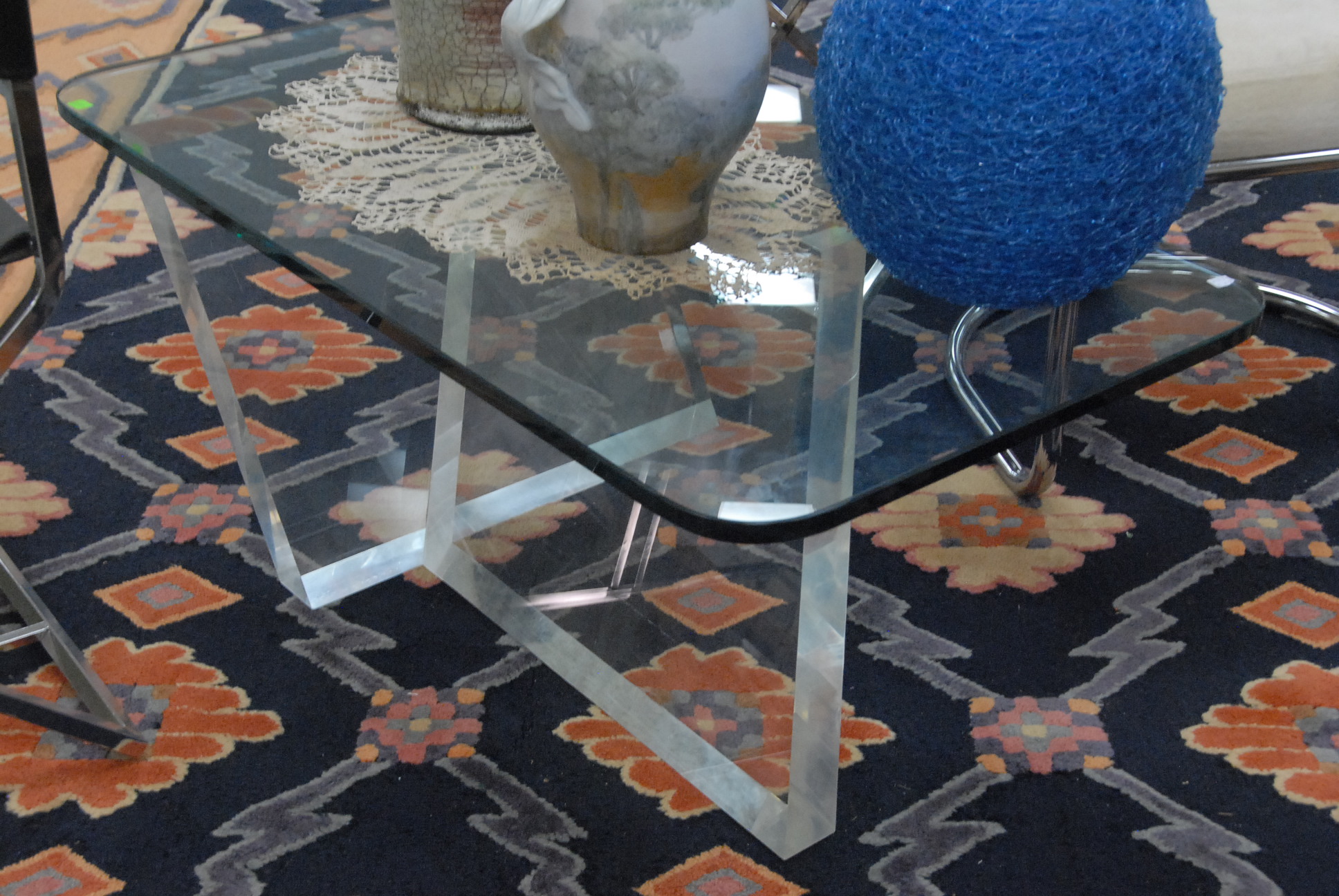 Signed Jeffrey Bigelow glass top coffee table with Lucite base, ht. 16 top: 24 x 42.