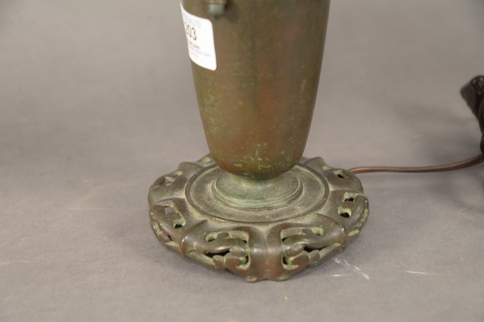 Lot 203: Small Handel Table or Desk Lamp, chipped ice domical and reverse painted shade on bronze base, in the form of a Chinese vase on base, shade signed Handel on rim, base marked: Handel, height 14 inches, shade diameter 10 inches.