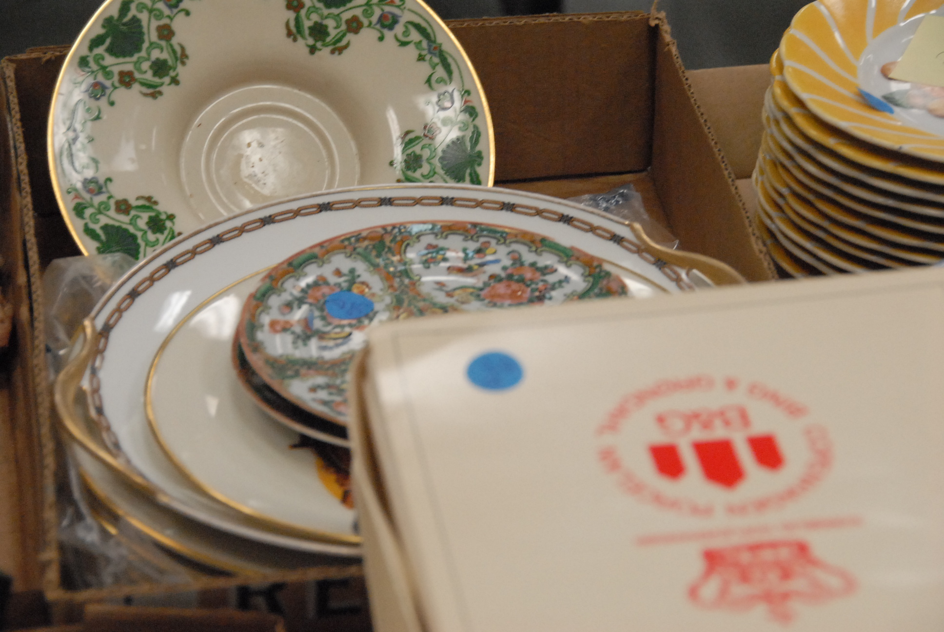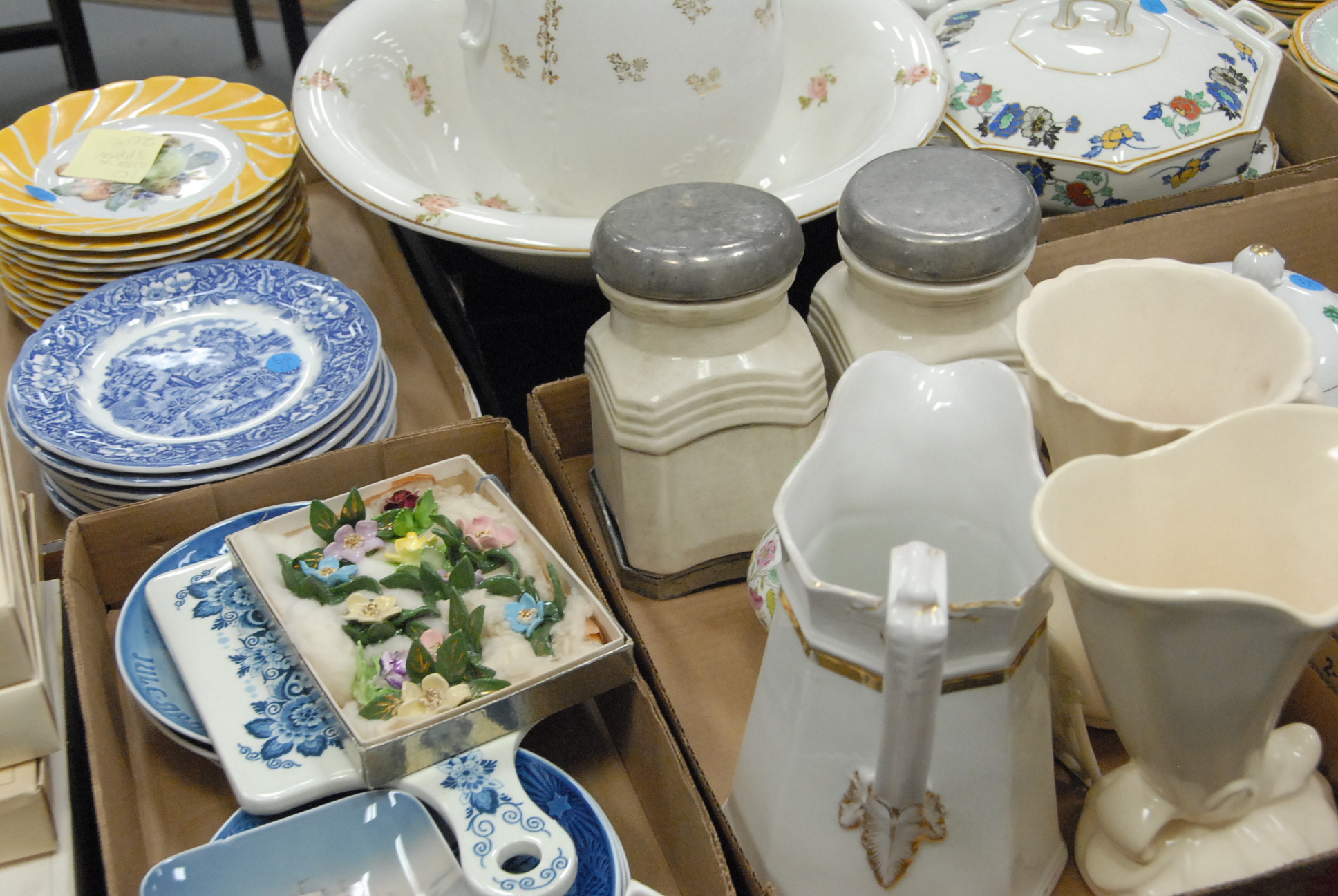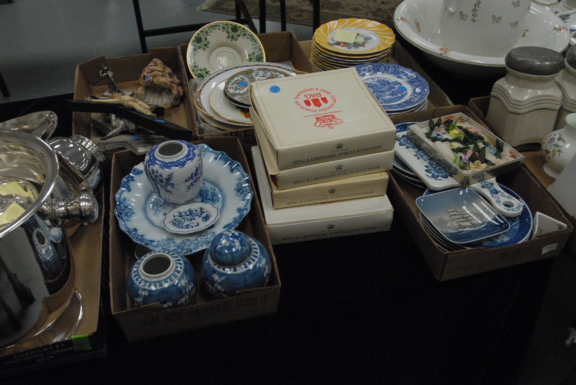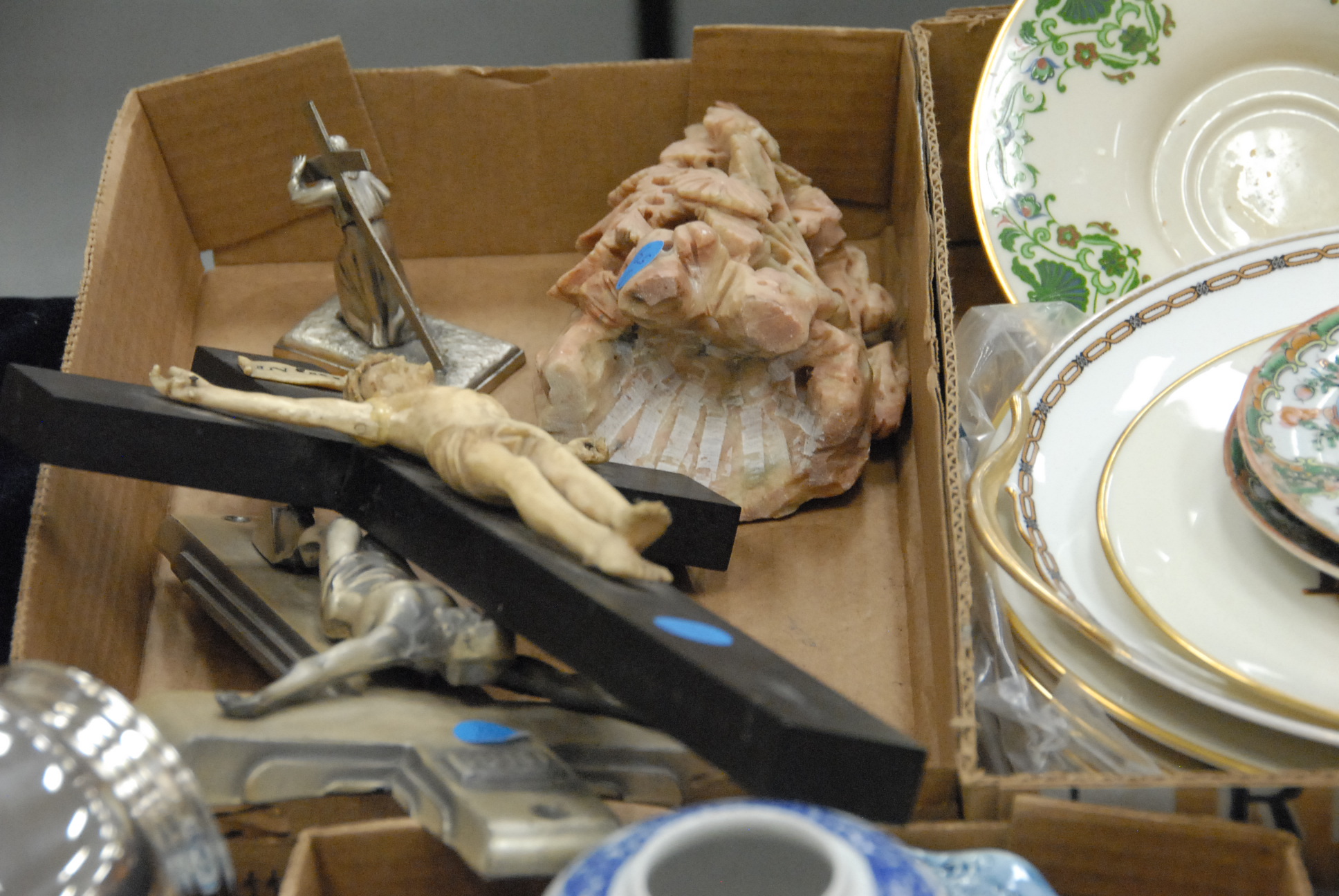 Twelve box lots including a pitcher, bowl, rose medallion plates, an ivory crucifix of Jesus, blue and white china, vases, silver plate, German breakfast set, and miscellaneous.