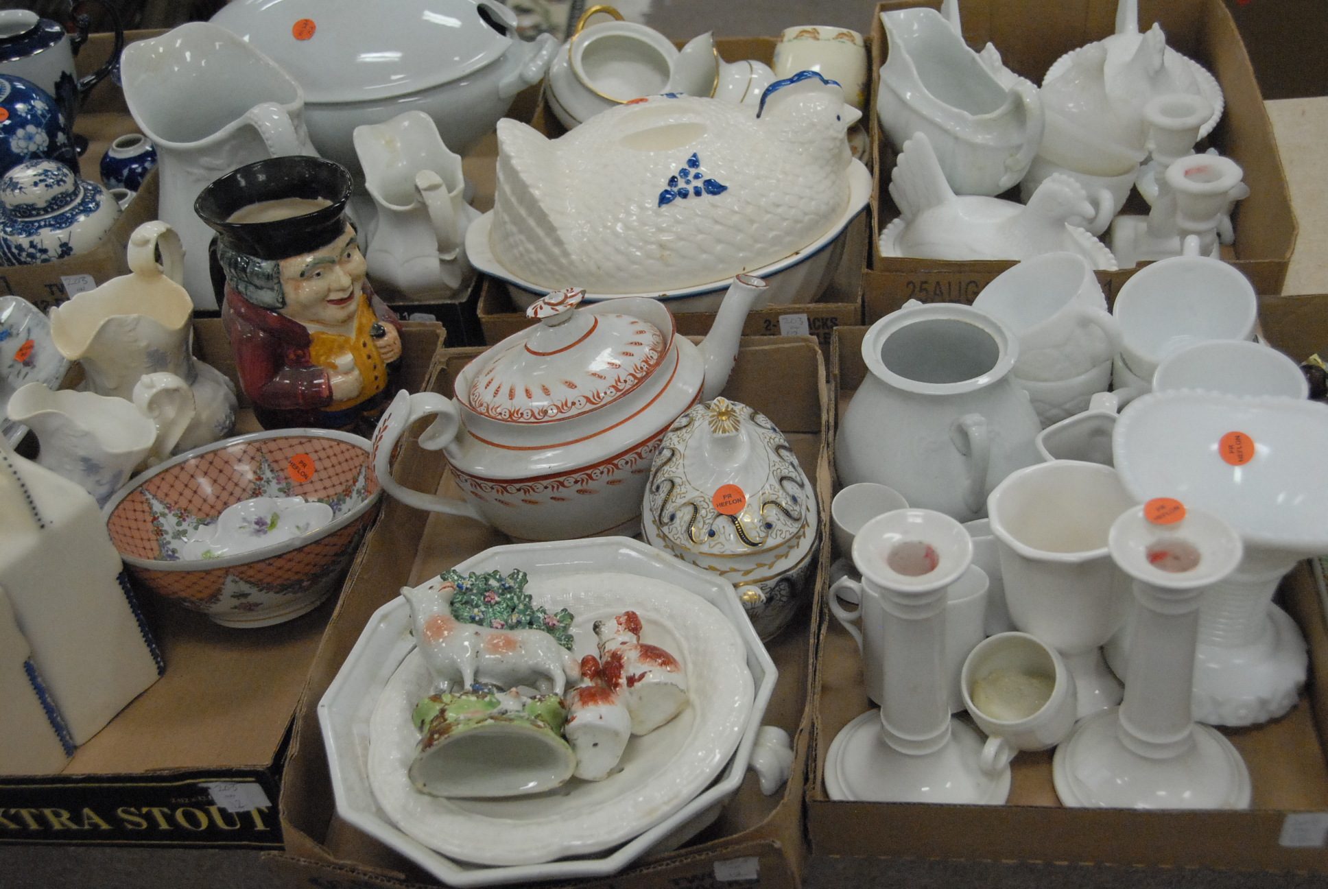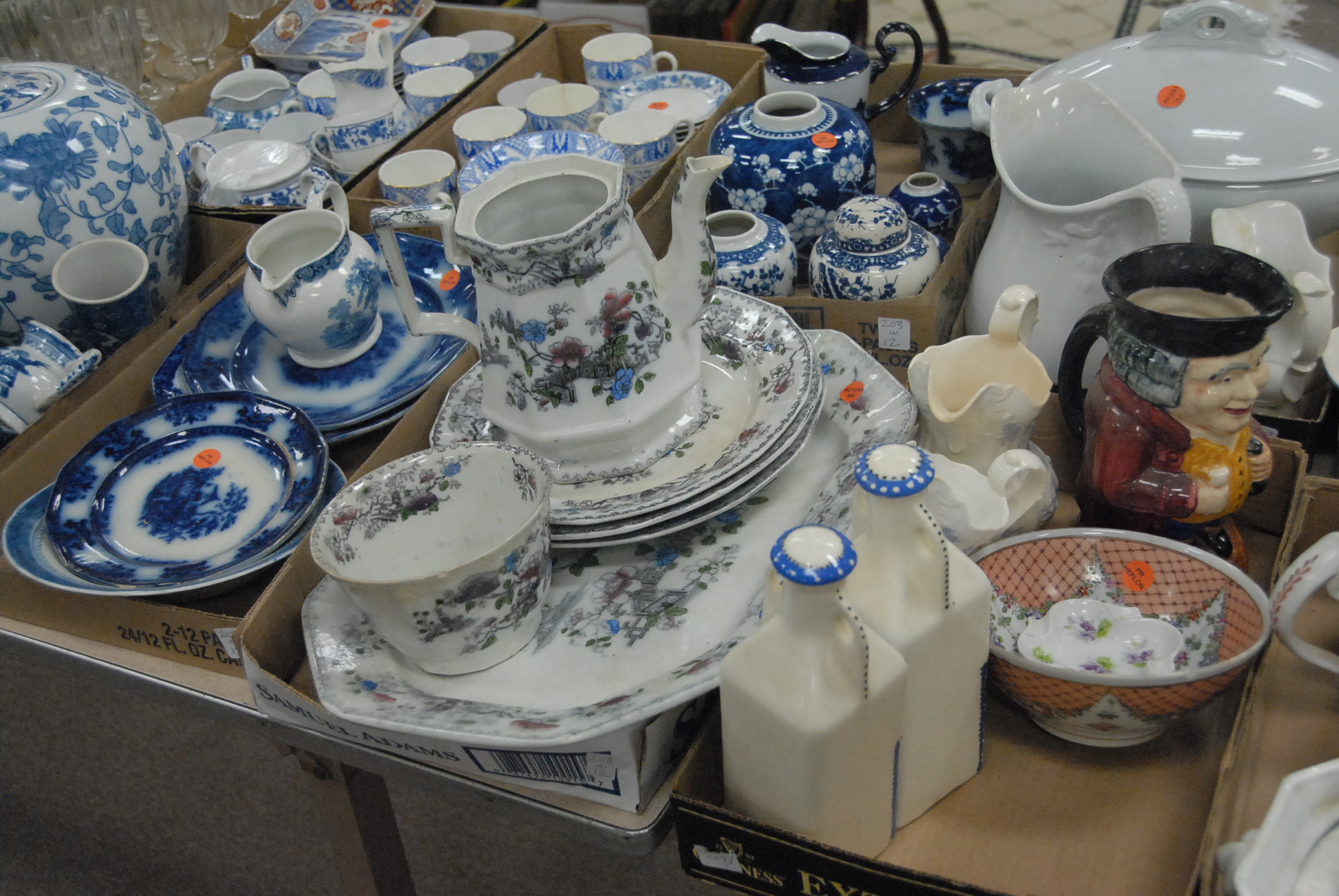 Twelve box lots including box lots of blue and white china, flow blue pieces, English platter, ironstone tureen, milk glass, 3 Staffordshire figures etc.