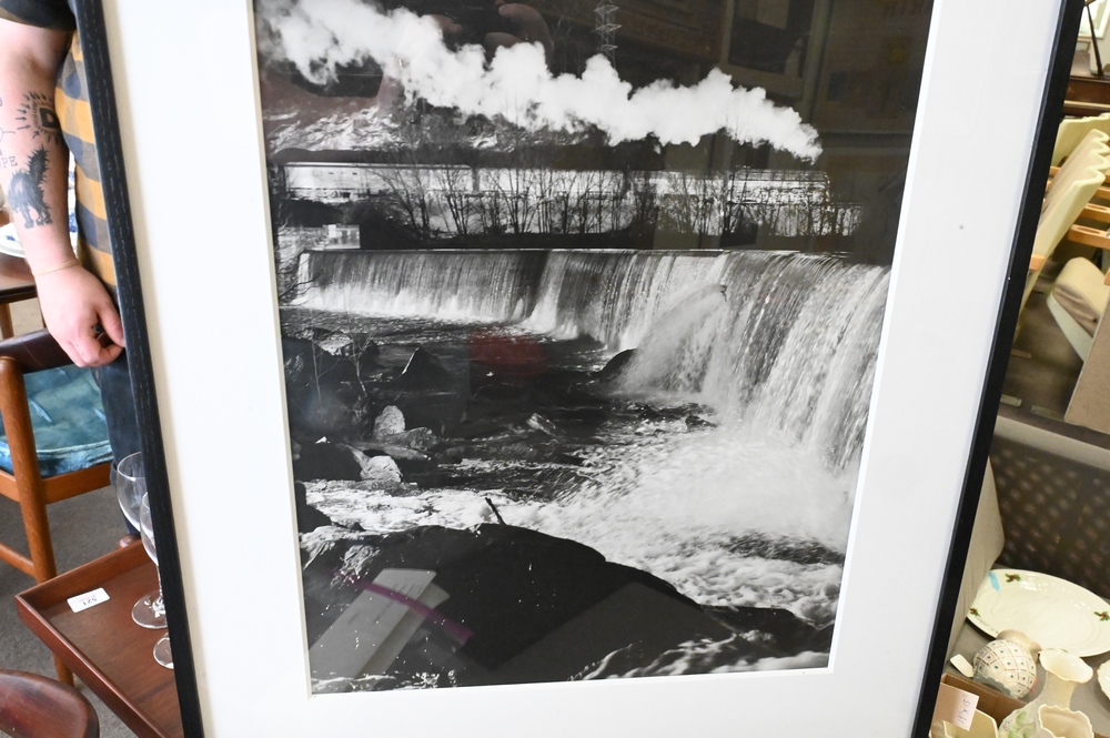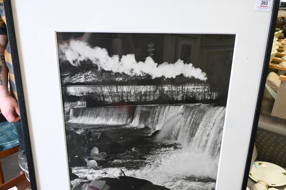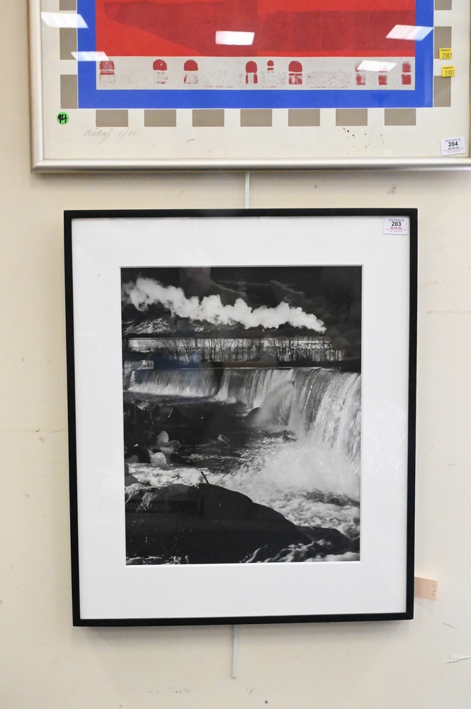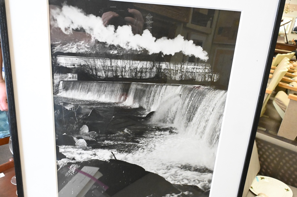 Lot 203: Winston Link (American, 1917 – 2001), Gooseneck Dam on the Maury River With Train No.2 Near Buffalo Forge, Virginia, 1956, gelatin-silver photograph, signed and stamped on the verso, artwork 19 1/2″ x 15 1/2″; frame 26 1/2″ x 22″. Provenance: An estate from Redding, CT.