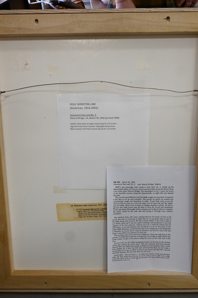 Winston Link (American, 1917 – 2001), Gooseneck Dam on the Maury River With Train No.2 Near Buffalo Forge, Virginia, 1956, gelatin-silver photograph, signed and stamped on the verso, artwork 19 1/2″ x 15 1/2″; frame 26 1/2″ x 22″. Provenance: An estate from Redding, CT.
