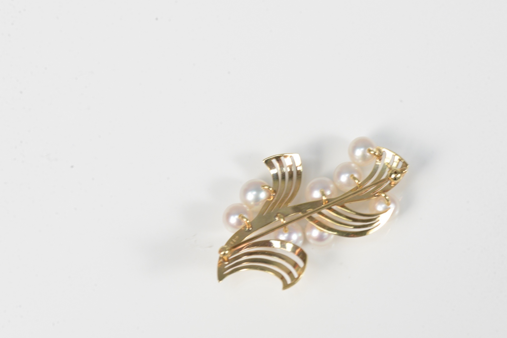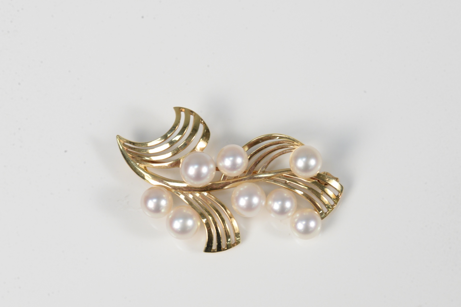 14K Gold Freerform Brooch set with eight pearls length 2 1/4 inches 11.8 grams