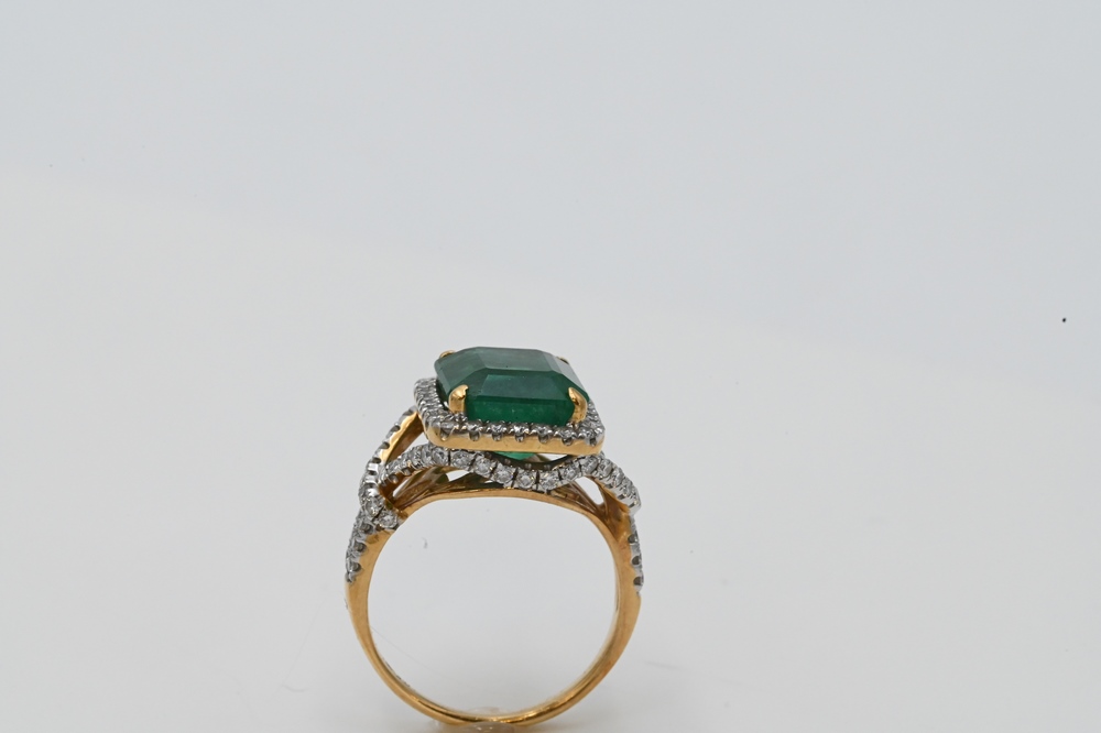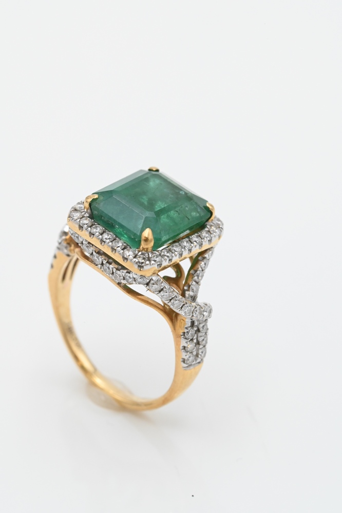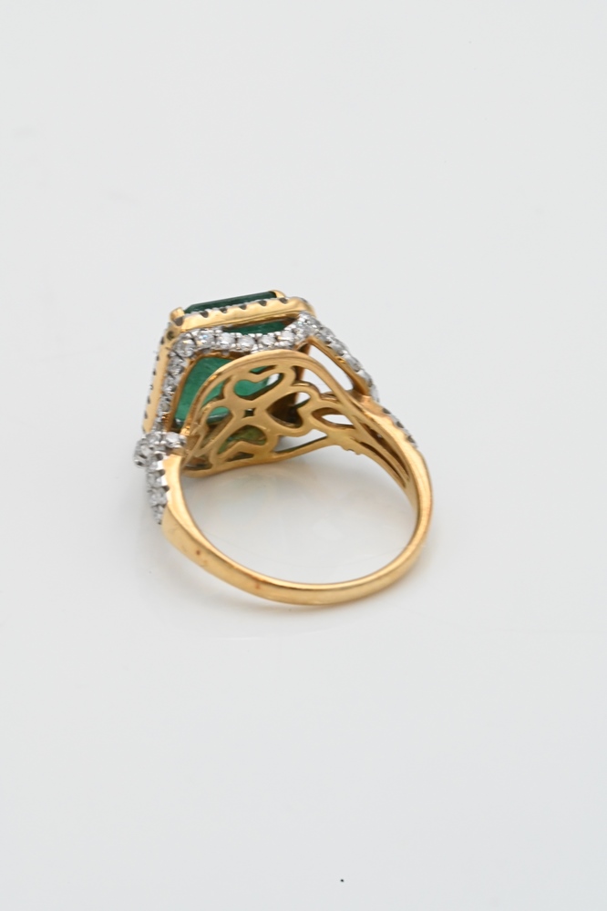 Lot 204: 18 Karat Yellow Gold Cocktail Ring, set with emerald cut emerald, 5.85 carats, and diamond surround, total carats 1.10, size 7.25.