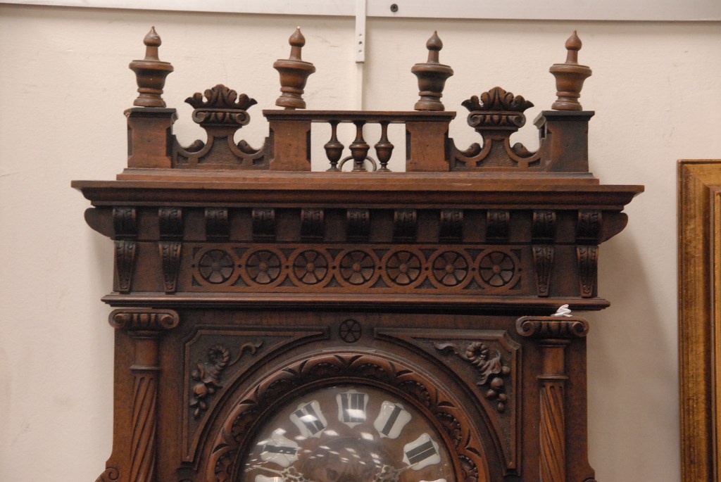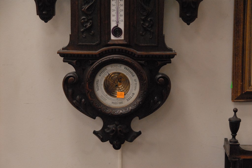 Lot 204: Black forest type clock barometer and thermometer with gallery top and porcelain numerals. ht. 41in. wd. 19in.