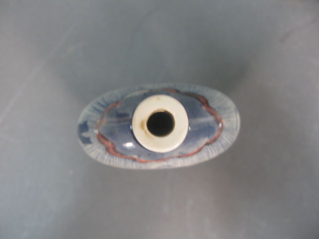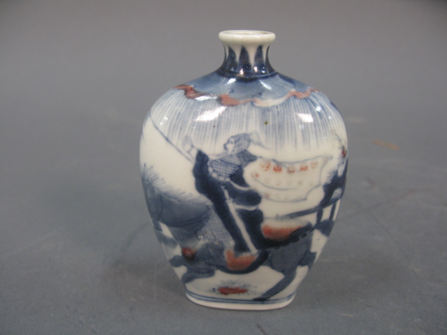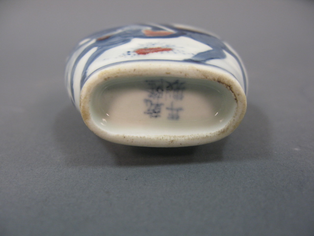 Blue and white porcelain snuff bottle having two figures riding horses.