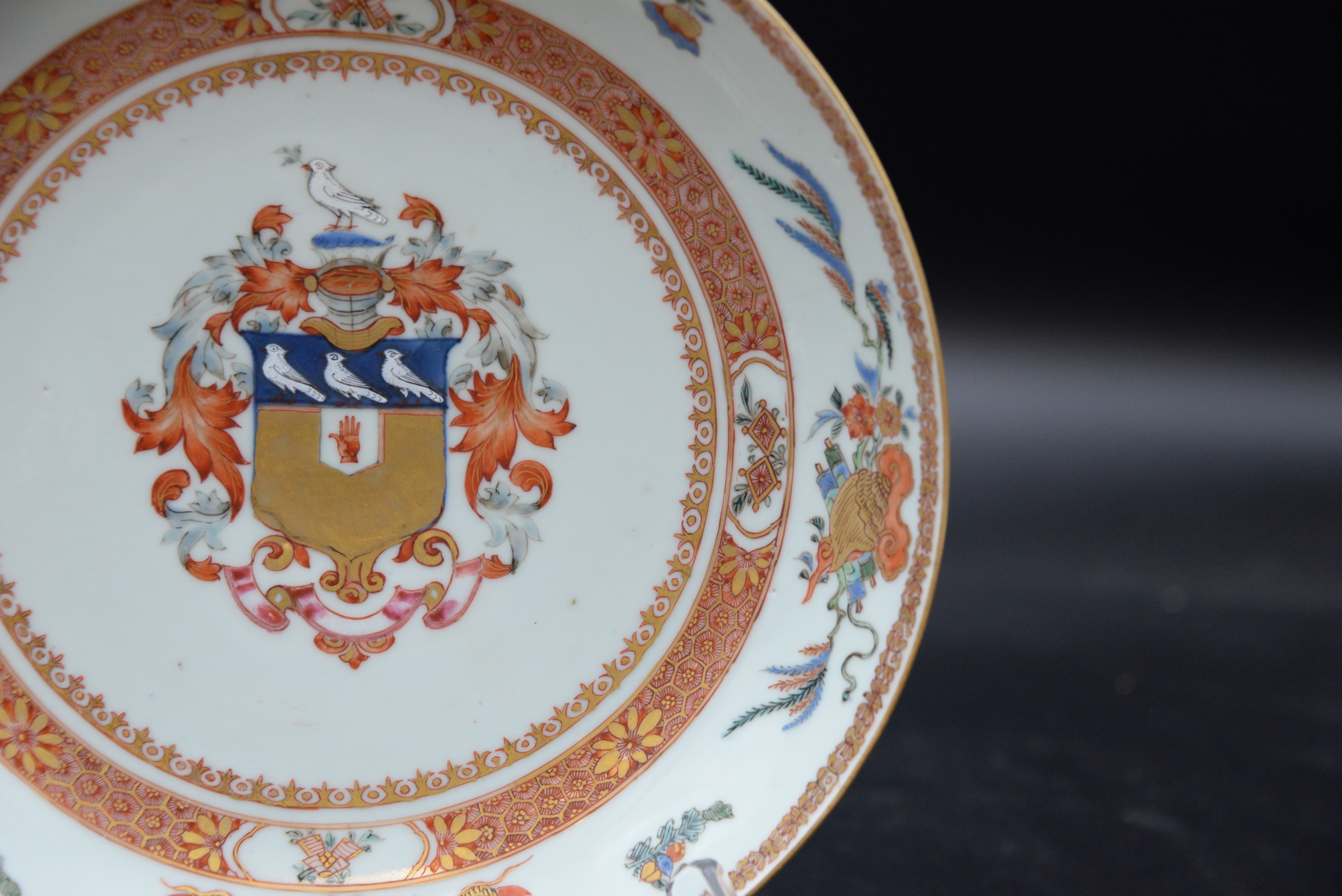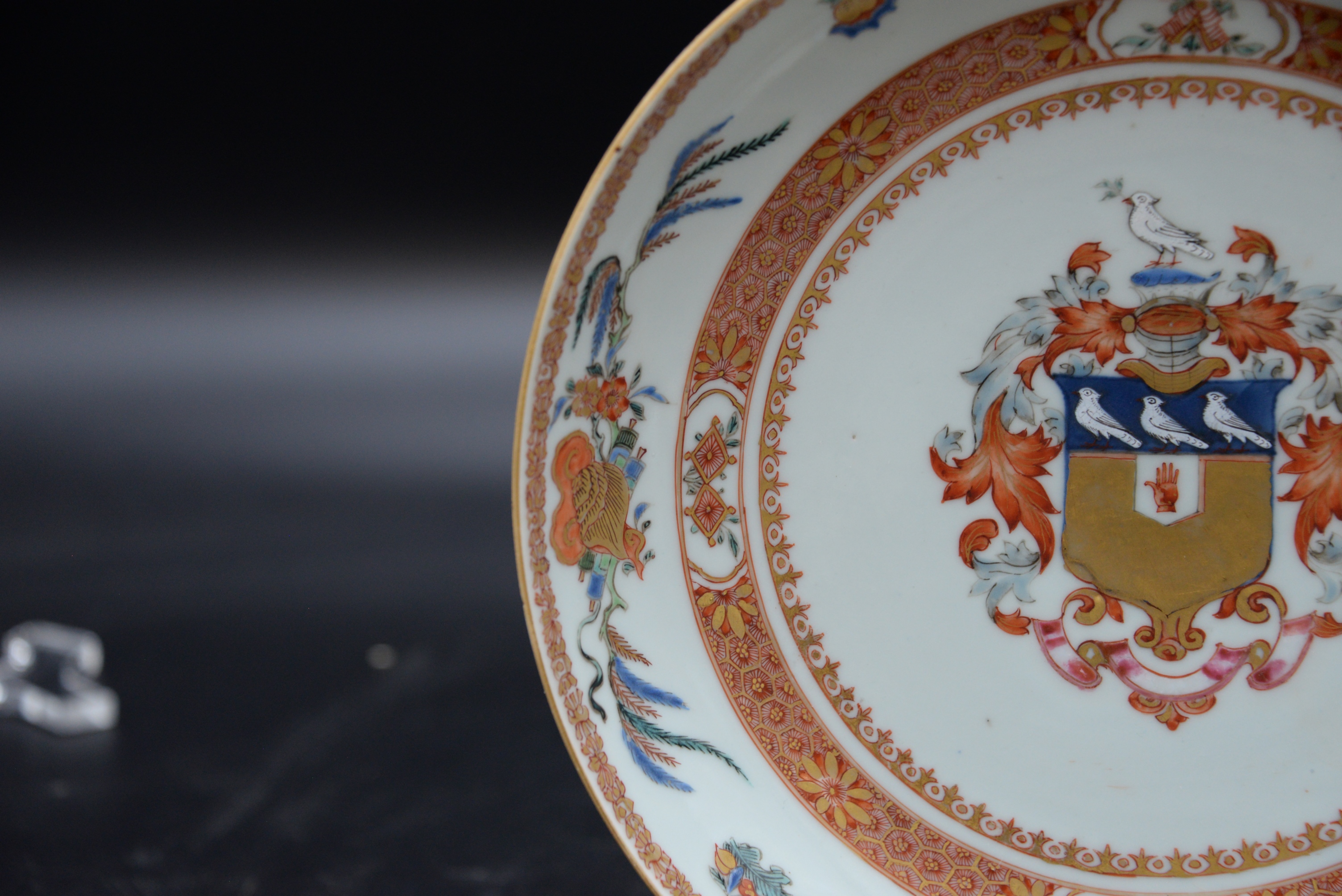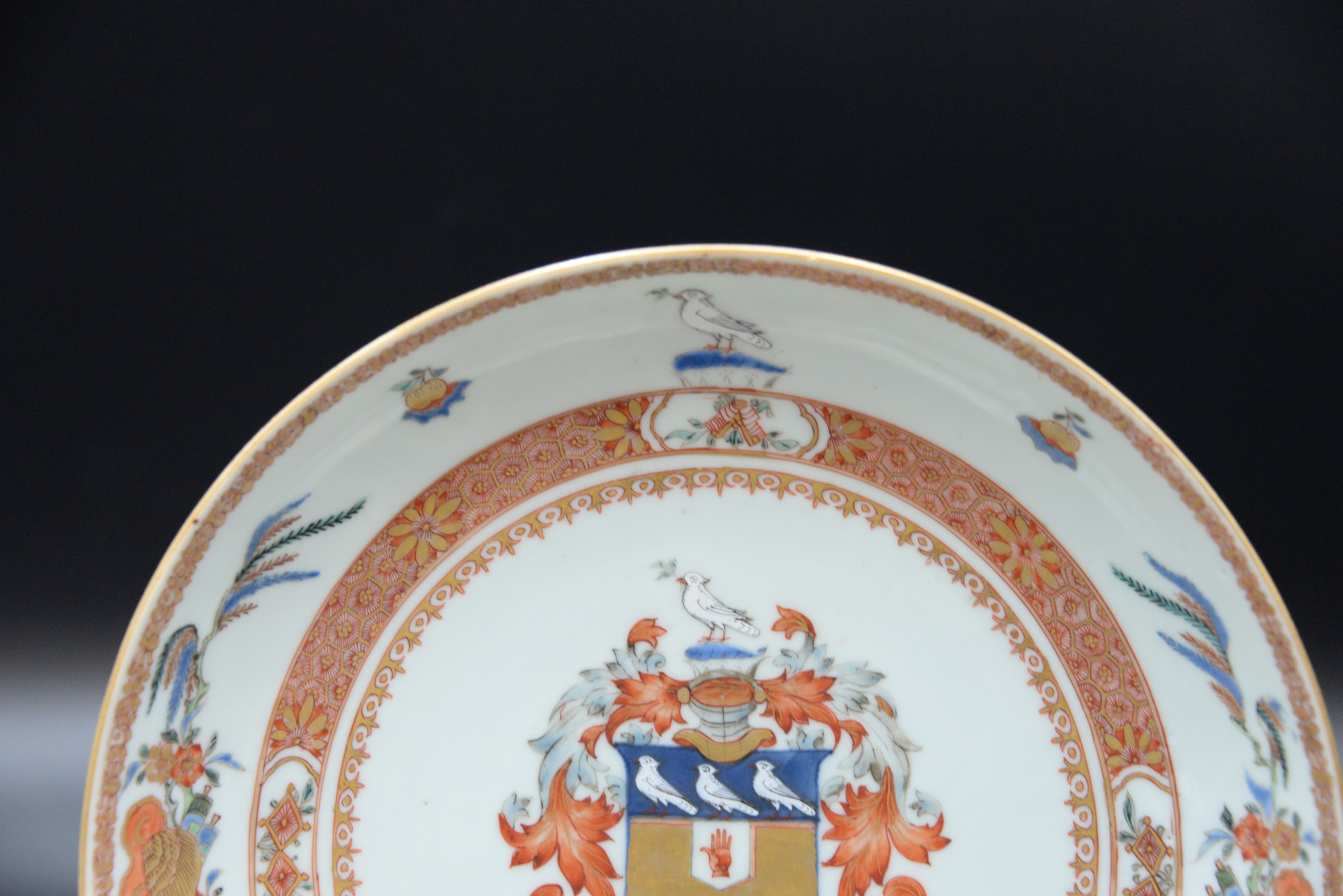 Chinese Export Armorial Deep Plate, having center Armorial with birds surrounded by iron red bands of flowers, bird and fish, with gilt decoration, height 1 1/2 inches, diameter 8 3/4 inches.