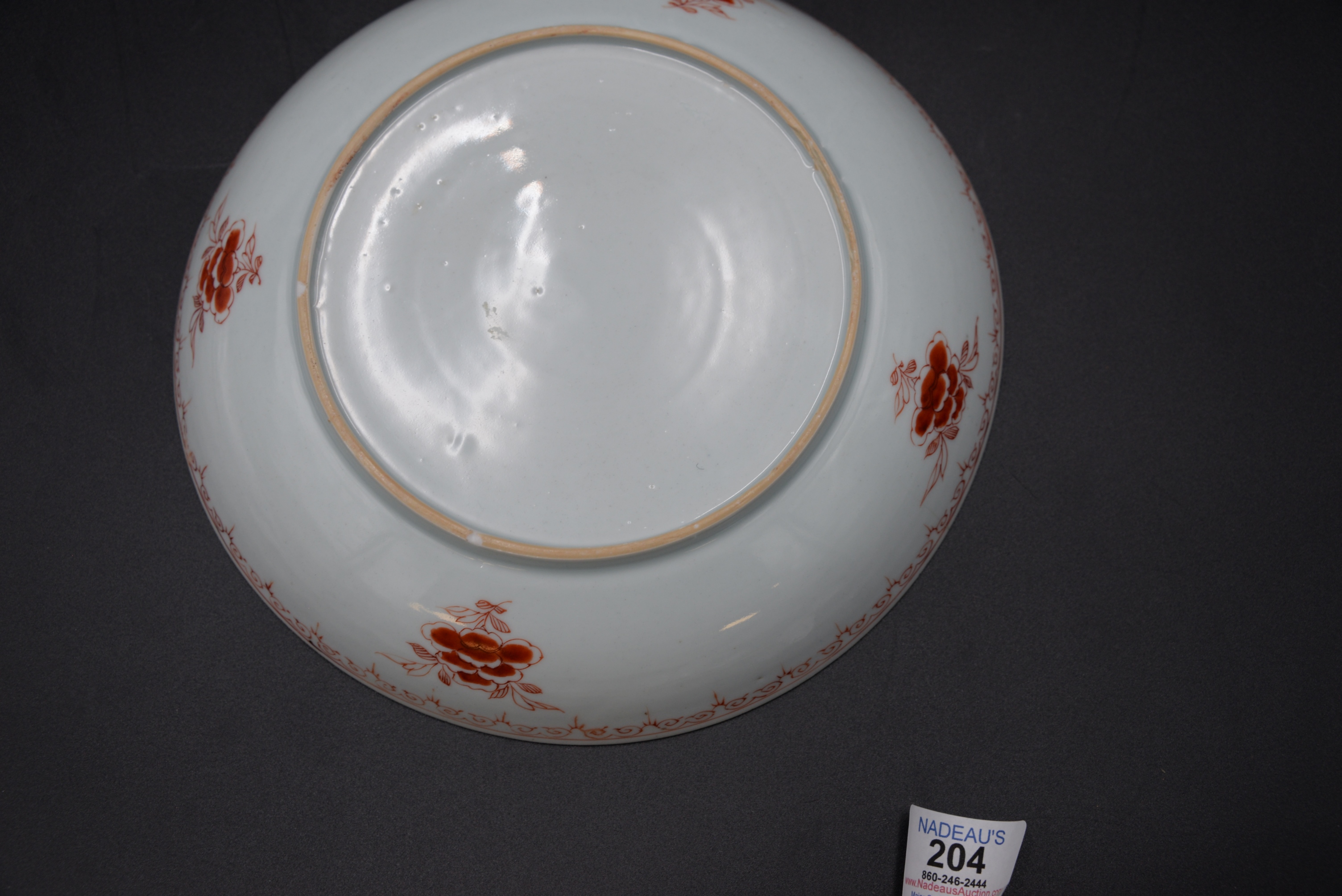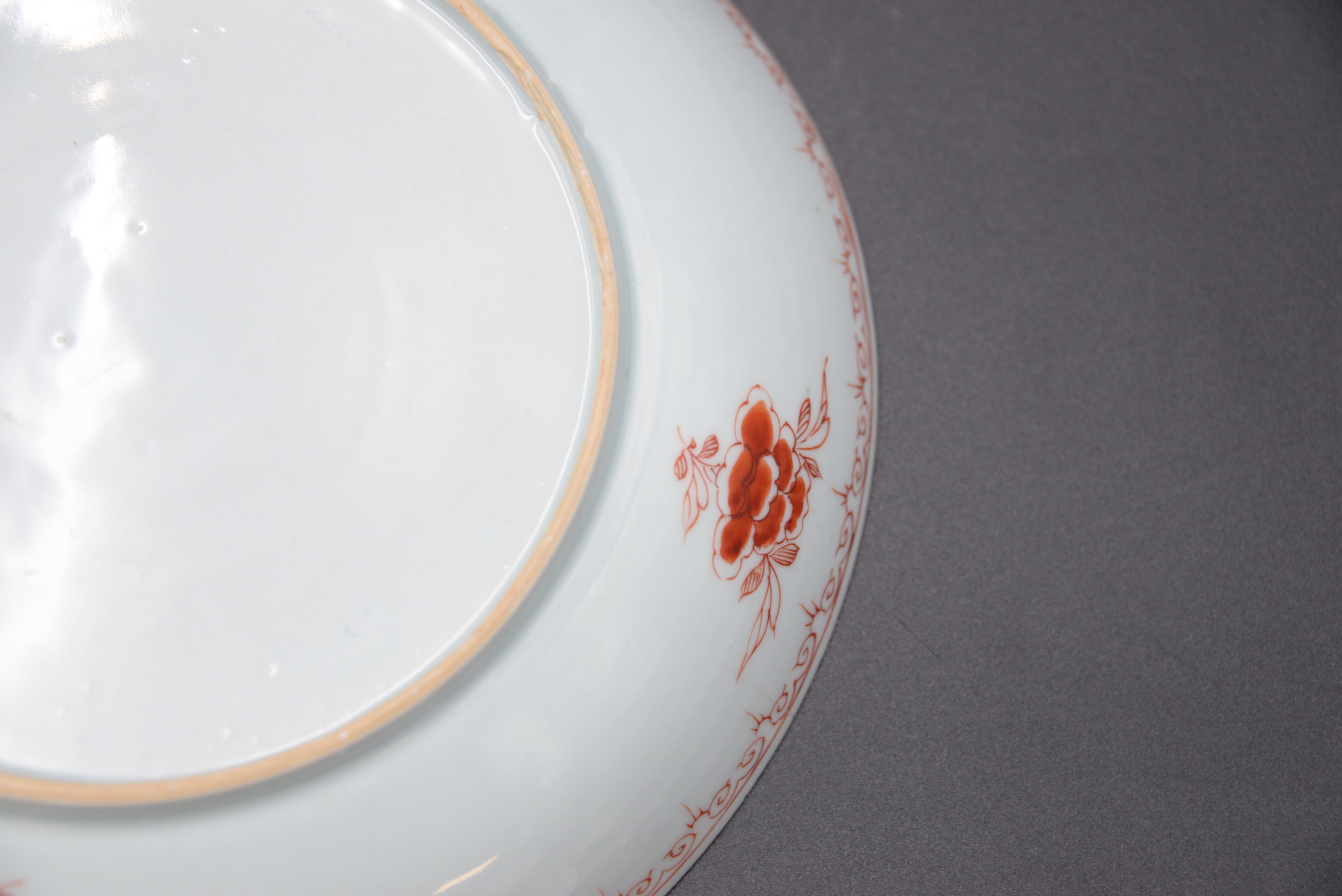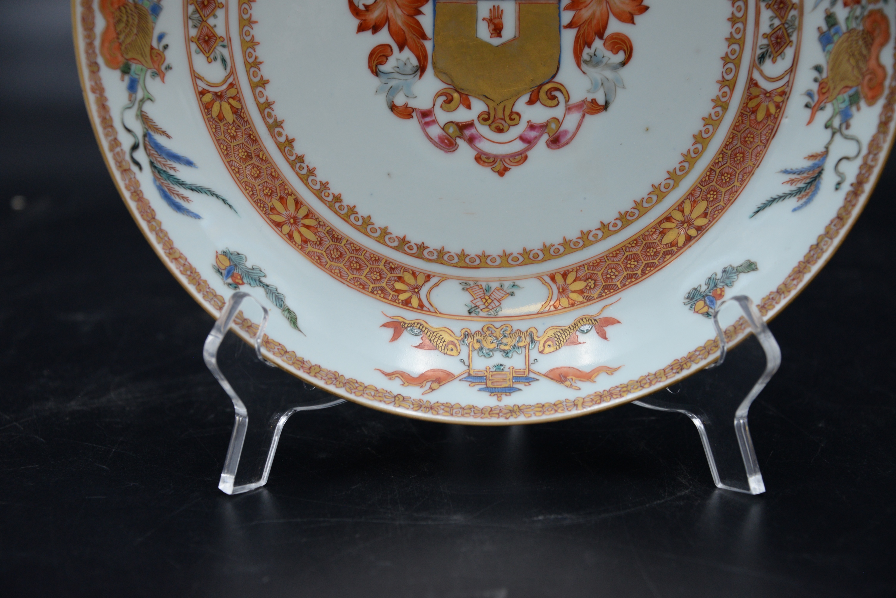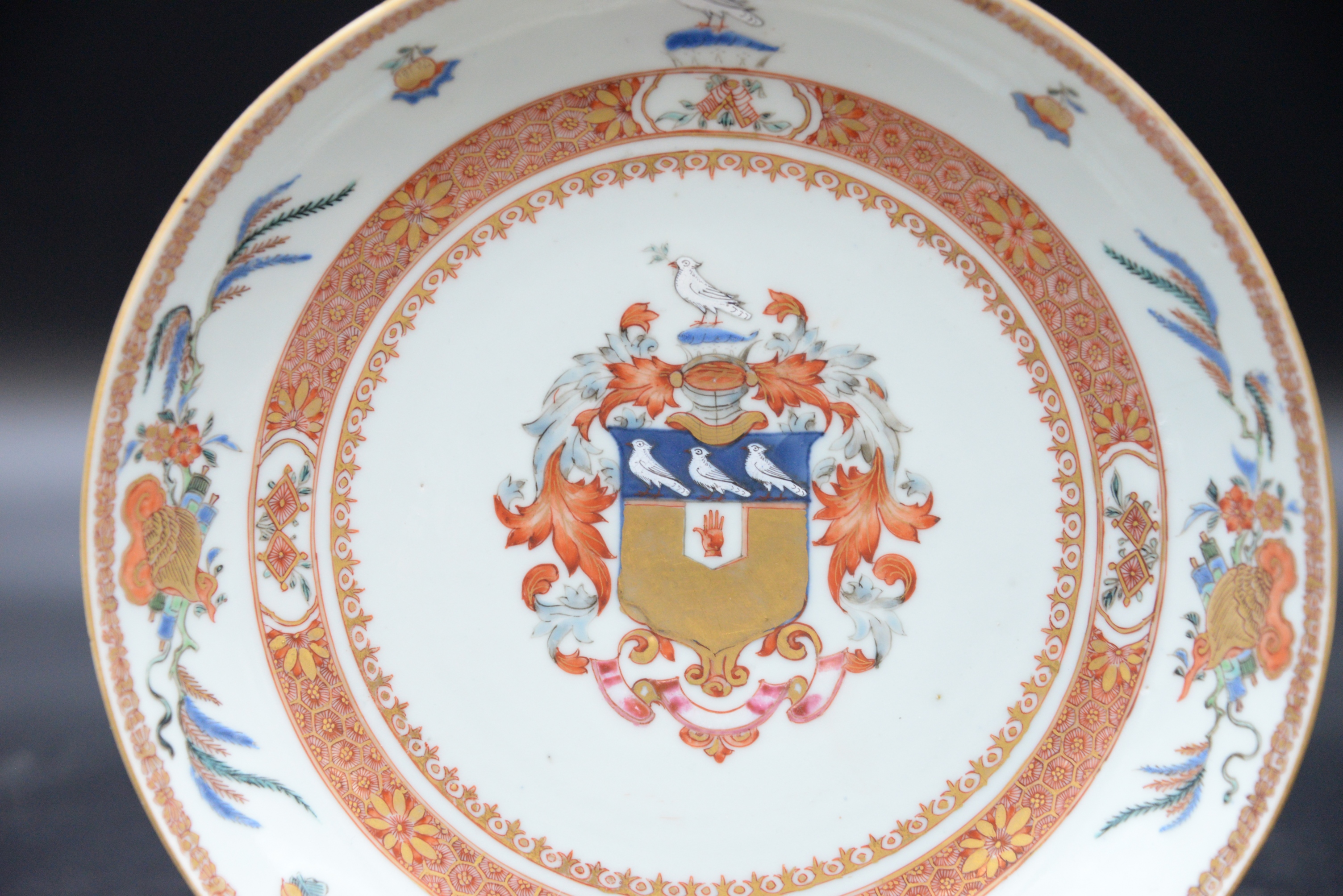 Chinese Export Armorial Deep Plate, having center Armorial with birds surrounded by iron red bands of flowers, bird and fish, with gilt decoration, height 1 1/2 inches, diameter 8 3/4 inches.