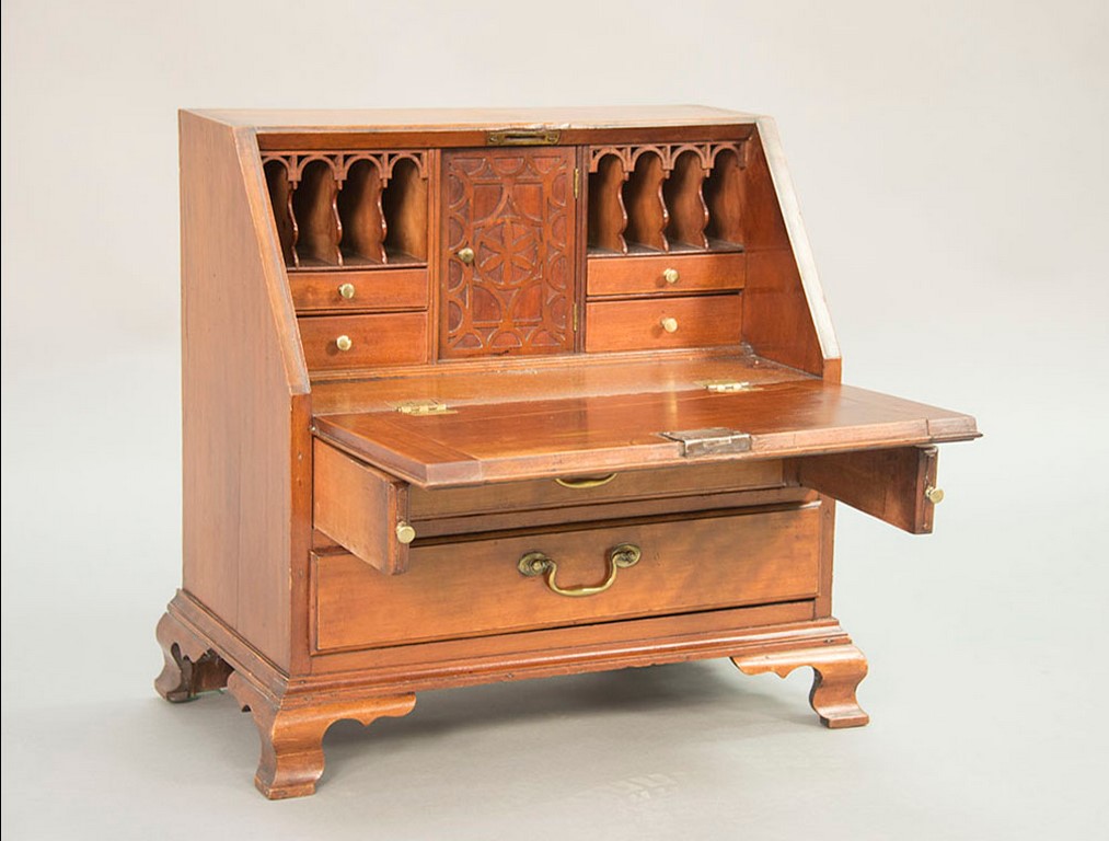 Chippendale cherry miniature desk having slant lid with shell carving opening to reveal drawered interior, interior prospect door carved with pinwheel and geometric carvings and carved valances on pigeon holes with blind fret carved door, flanked by open carved valances in pigeon holes over two graduated drawers set on ogee bracket feet, circa 1770-1780. writing ht. 12 in. ht. 21 1/4 in. case wd. 20 1/2 in. dp. 12 in. Provenance: Nathan Liverant & Son The Estate of Sylvia Leven Included Documentation: Copy of original Bill of Sale 1993