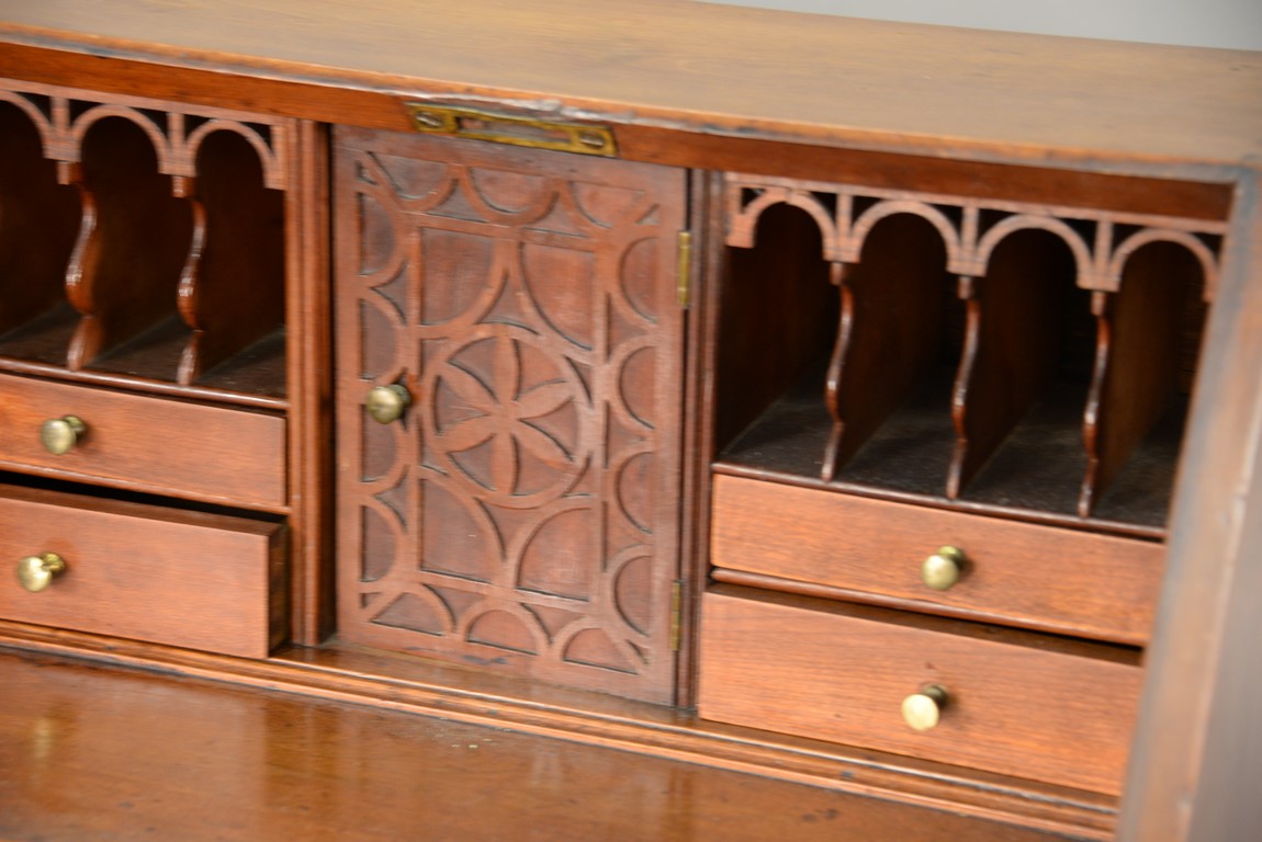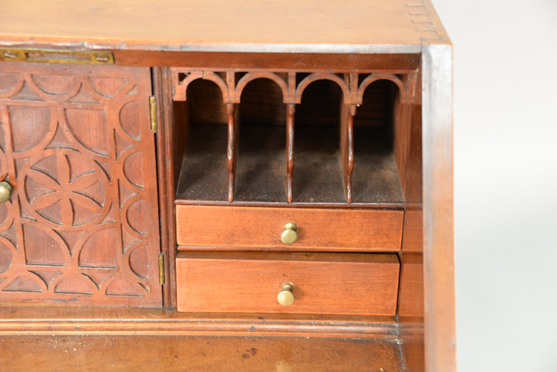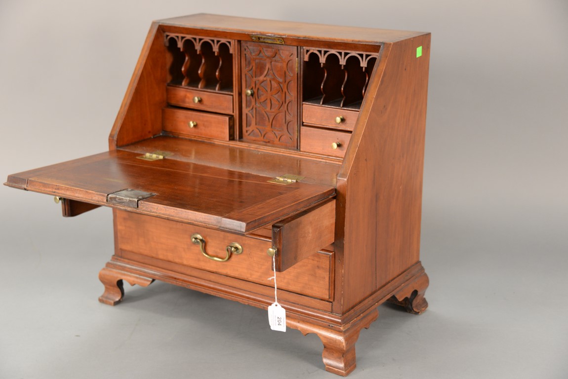 Lot 204: Chippendale cherry miniature desk having slant lid with shell carving opening to reveal drawered interior, interior prospect door carved with pinwheel and geometric carvings and carved valances on pigeon holes with blind fret carved door, flanked by