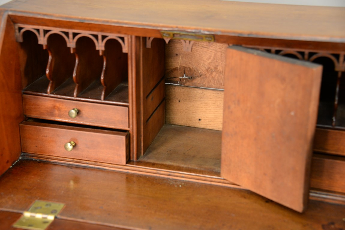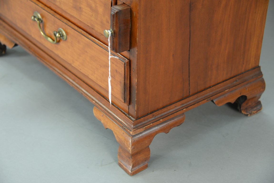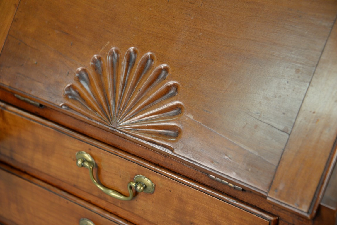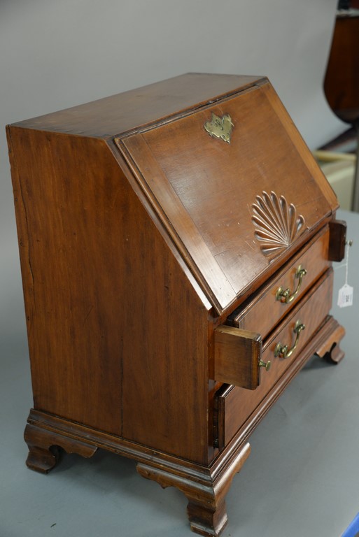 Chippendale cherry miniature desk having slant lid with shell carving opening to reveal drawered interior, interior prospect door carved with pinwheel and geometric carvings and carved valances on pigeon holes with blind fret carved door, flanked by open carved valances in pigeon holes over two graduated drawers set on ogee bracket feet, circa 1770-1780. writing ht. 12 in. ht. 21 1/4 in. case wd. 20 1/2 in. dp. 12 in. Provenance: Nathan Liverant & Son The Estate of Sylvia Leven Included Documentation: Copy of original Bill of Sale 1993