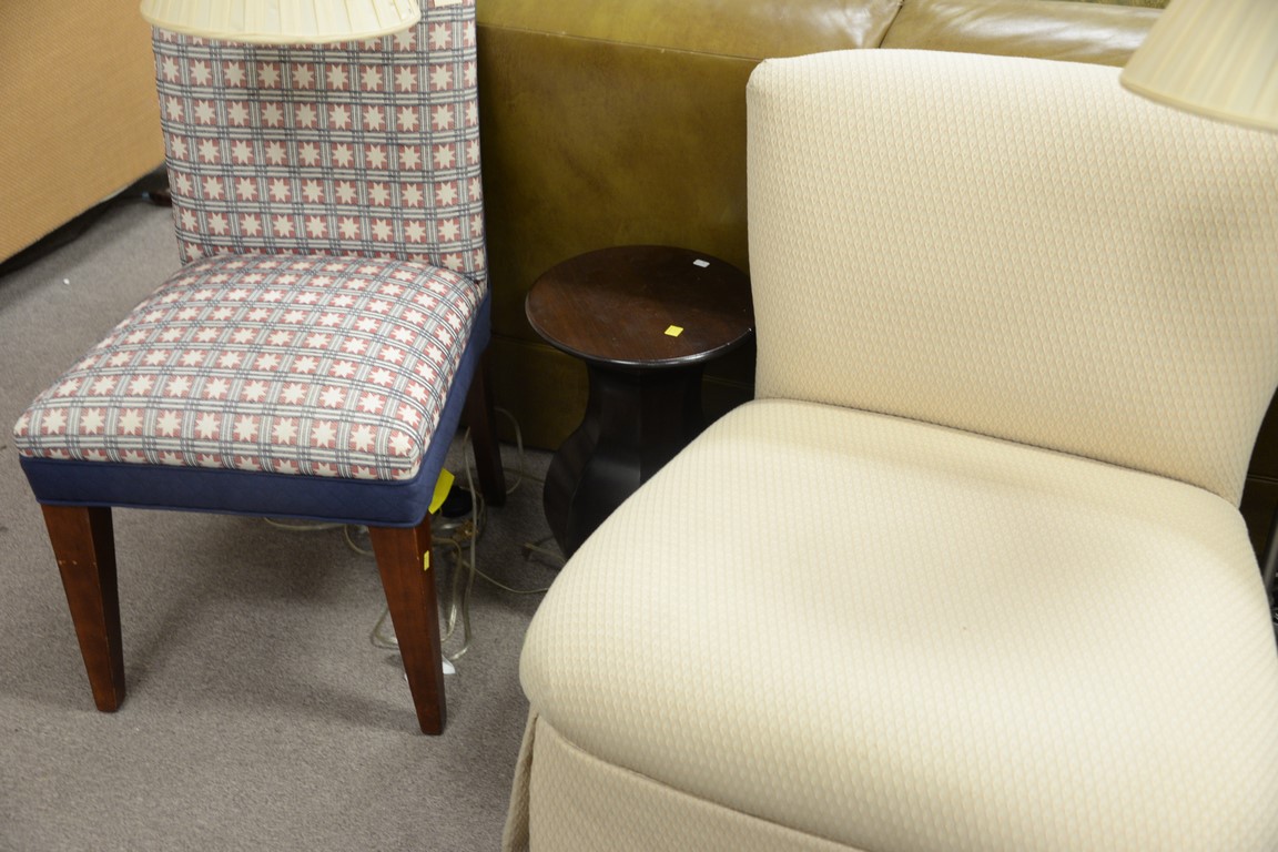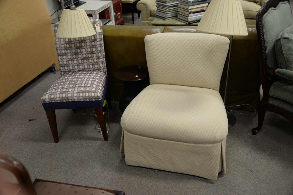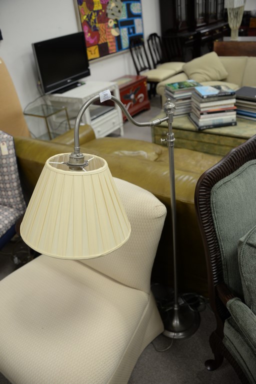 Lot 204: Contemporary seven piece lot to include two upholstered chairs, two stainless floor lamps, a round stand ht. 19in., and a pair of …
