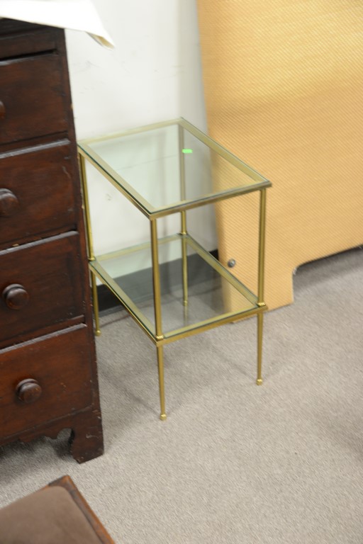 Contemporary seven piece lot to include two upholstered chairs, two stainless floor lamps, a round stand ht. 19in., and a pair of glass and brass two tier stands.