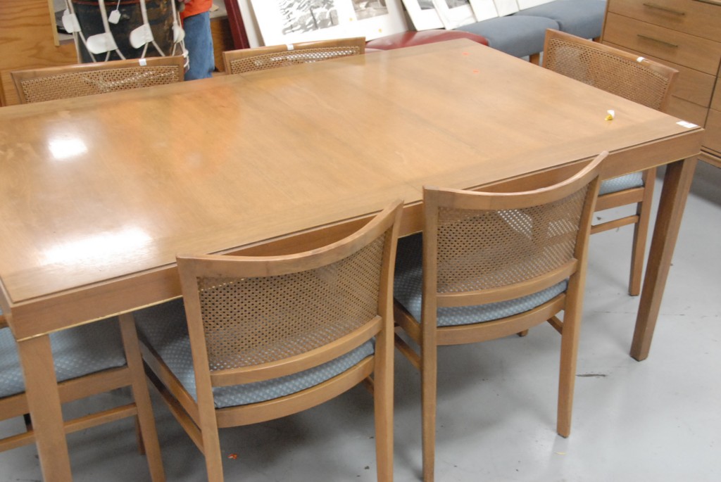 Eight piece lot Johnson Furniture Company Grand Rapids MI mid century dining table, six chairs with caned backs, and credenza.