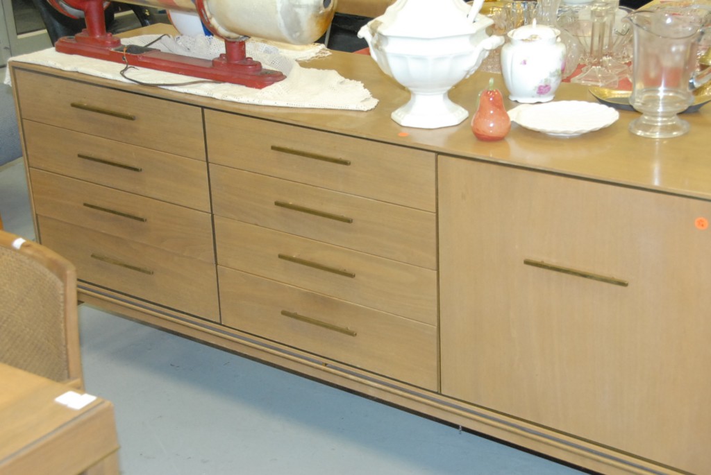 Lot 204: Eight piece lot Johnson Furniture Company Grand Rapids MI mid century dining table, six chairs with caned backs, and credenza.