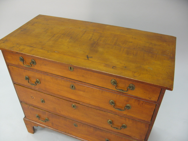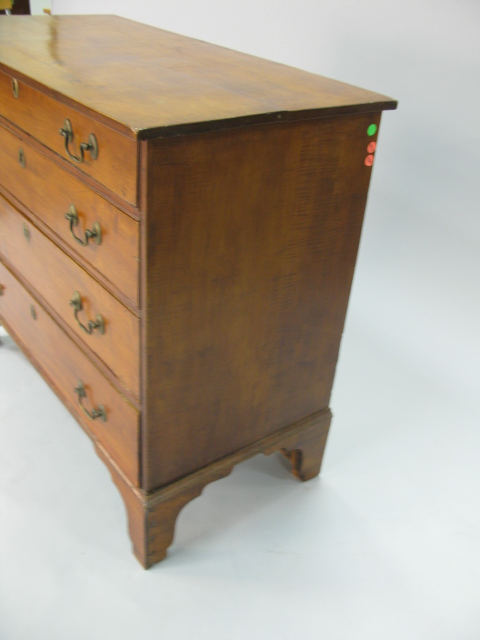 Figured maple Chippendale four drawer chest on high cut out bracket feet, with original bail brasses.