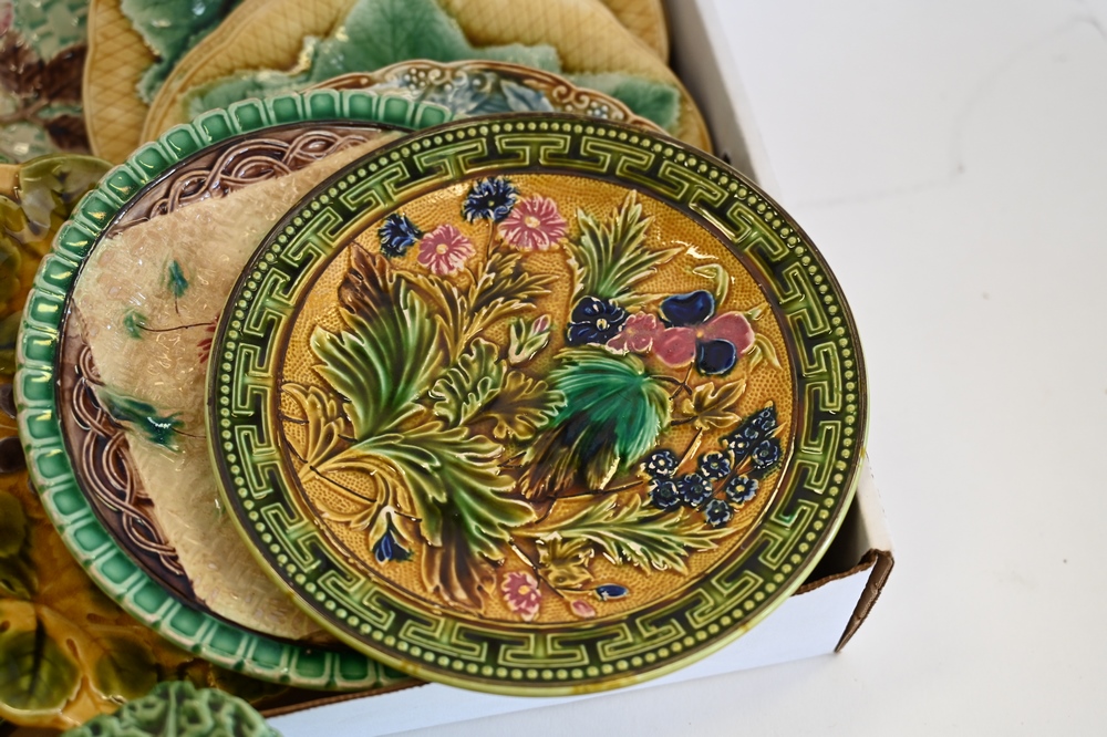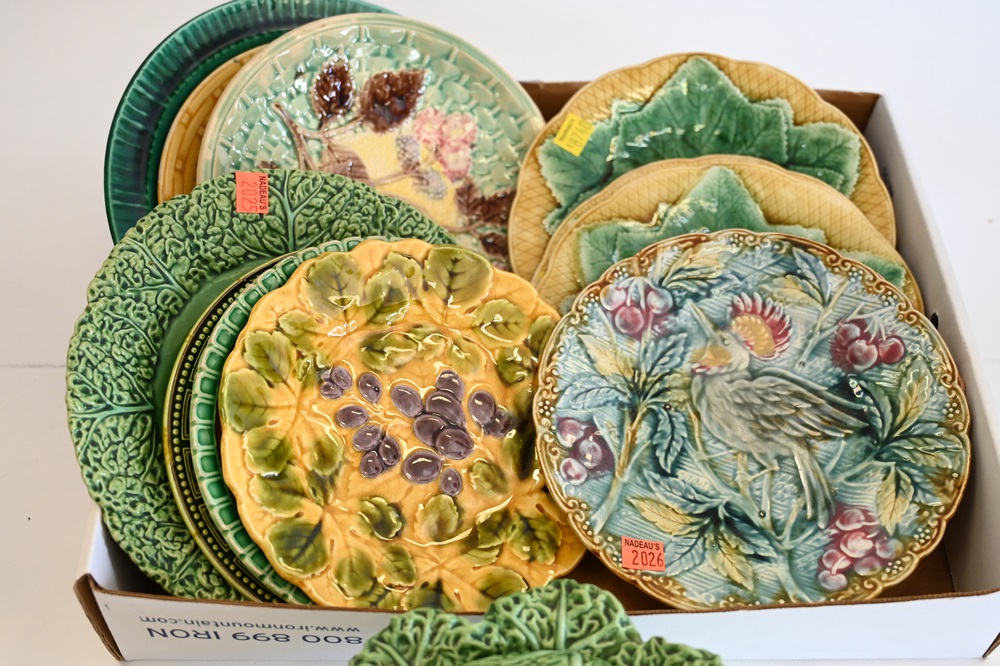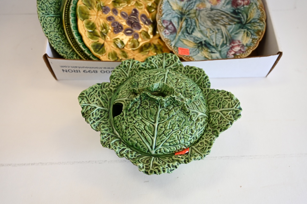Lot 204: Group of Majolica Plates, to include a set of four, one with a bird, cabbage covered serving dish, etc., largest diameter 10 inches.