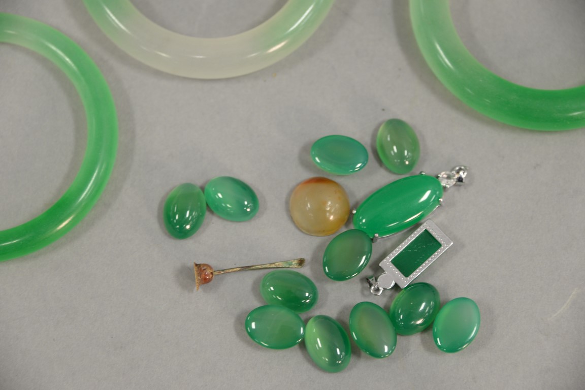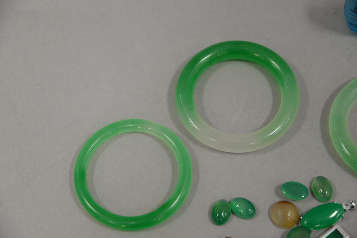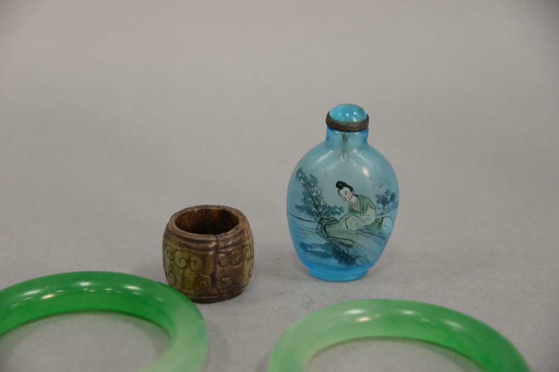 Group of Oriental jewelry to include three jadeight bracelets, reverse painted snuff bottle, hardstone ring, and a small group of jadeight beads.