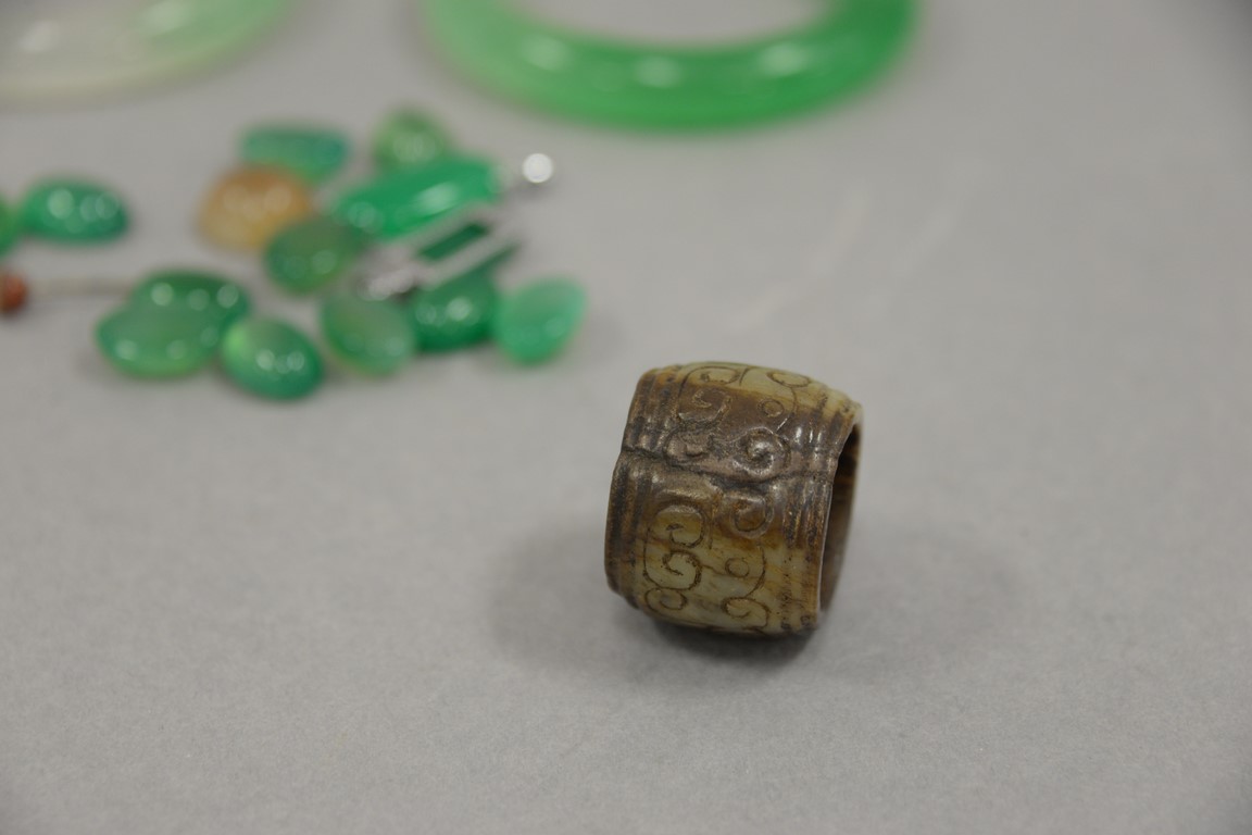 Lot 204: Group of Oriental jewelry to include three jadeight bracelets, reverse painted snuff bottle, hardstone ring, and a small group of ja…