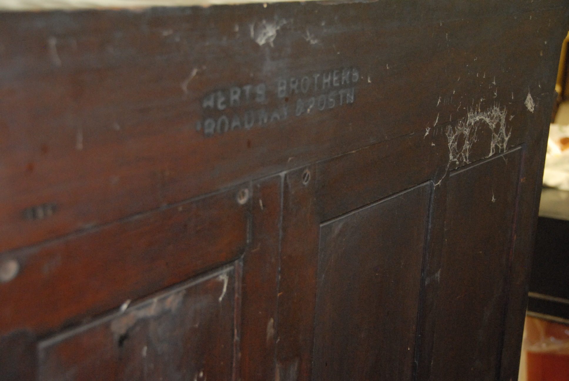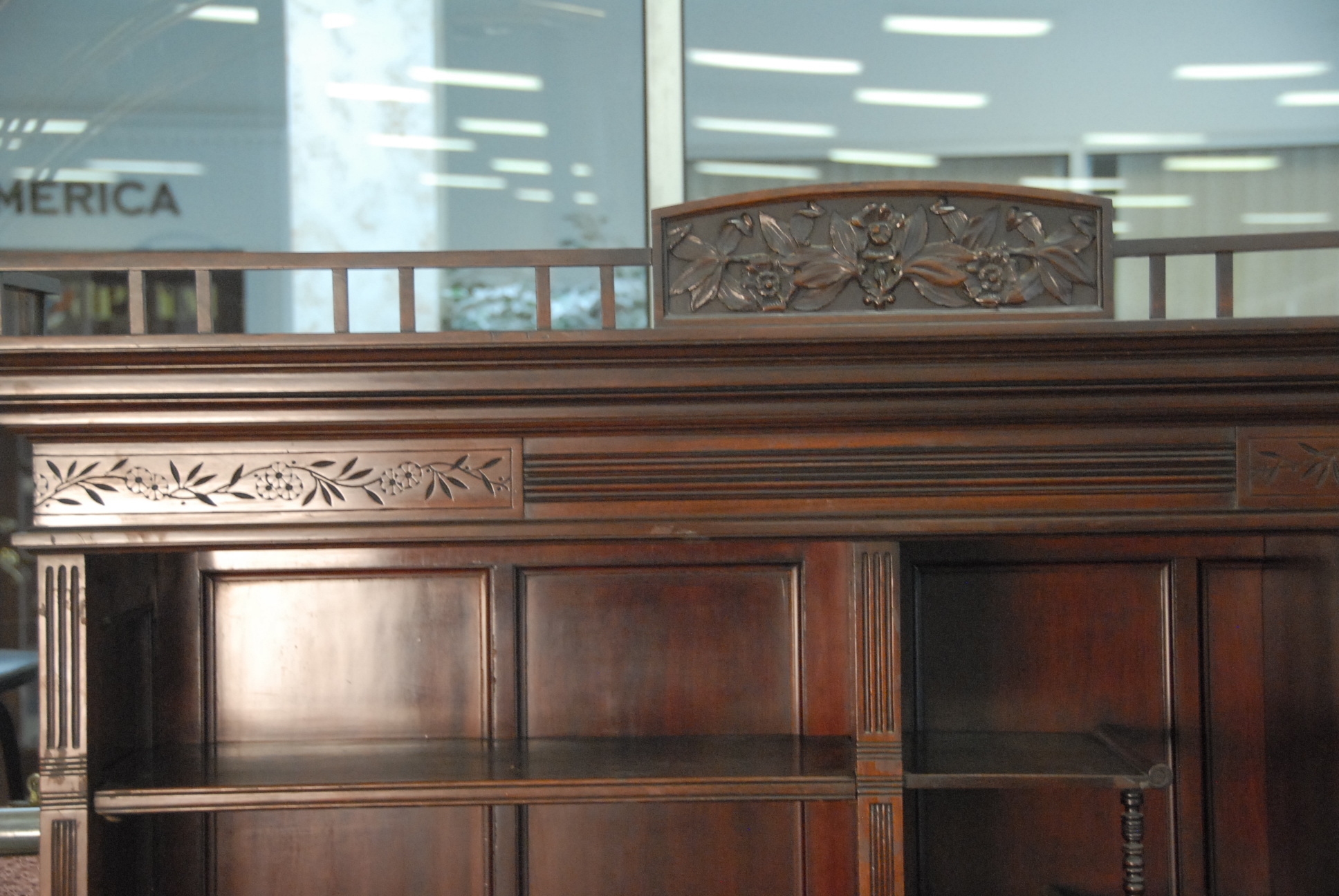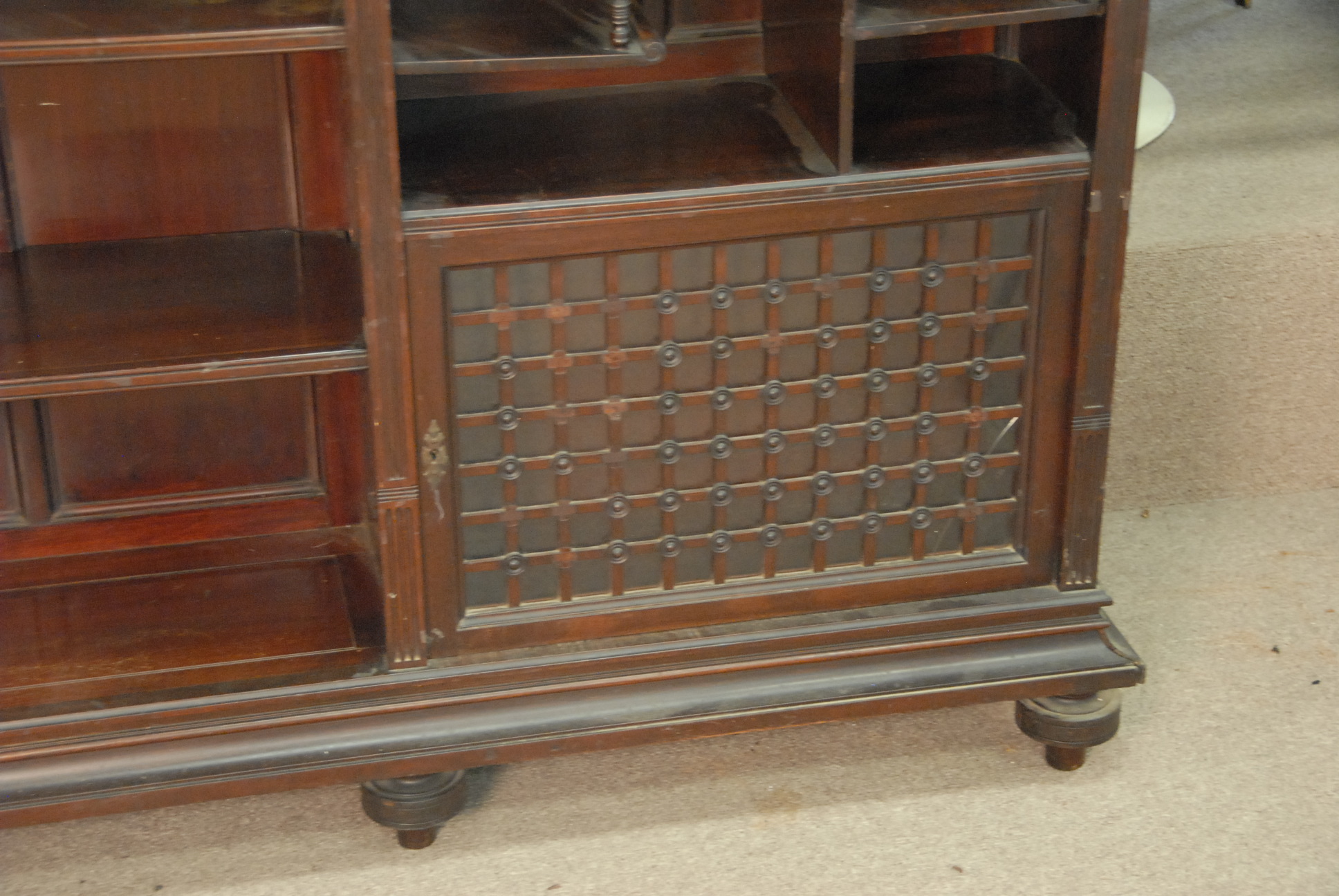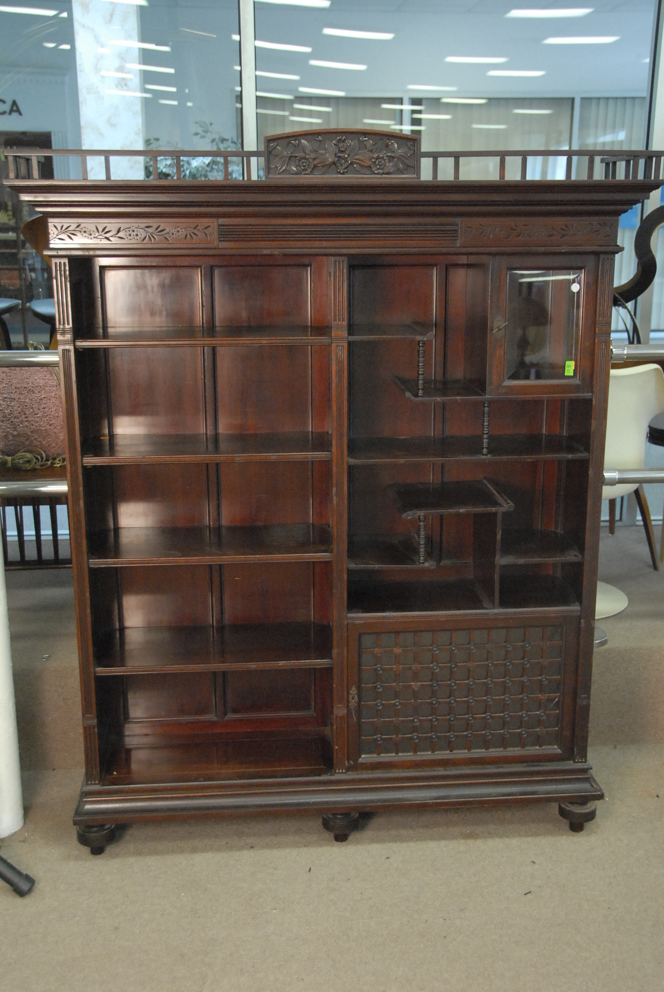 Herts Brothers Victorian walnut bookcase having shelves and two glass doors.