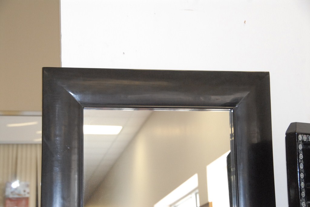 Large dressing mirror with wide black frame, ht. 79, wd. 27 1/2.