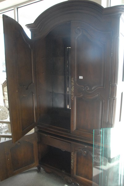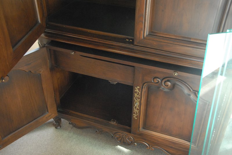 Louis XV style bar/cabinet two parts with glass shelves and mirror back, four doors, and pull out slide. ht. 88in. wd. 41 1/2in.
