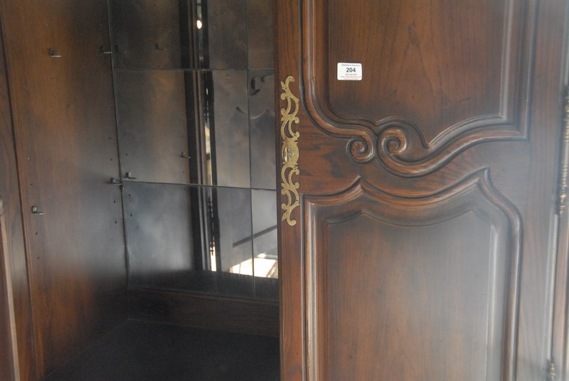 Lot 204: Louis XV style bar/cabinet two parts with glass shelves and mirror back, four doors, and pull out slide. ht. 88in. wd. 41 1/2in.