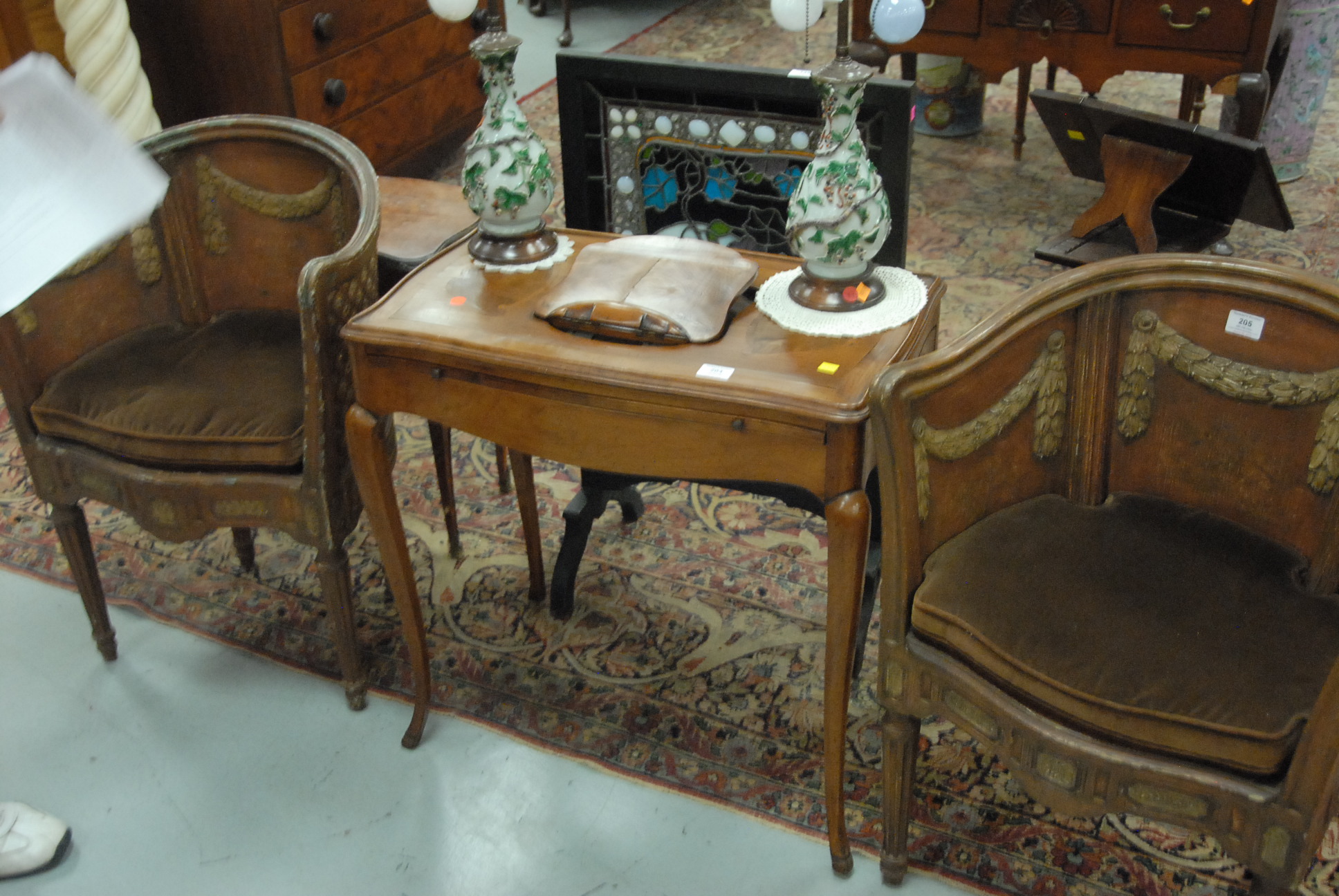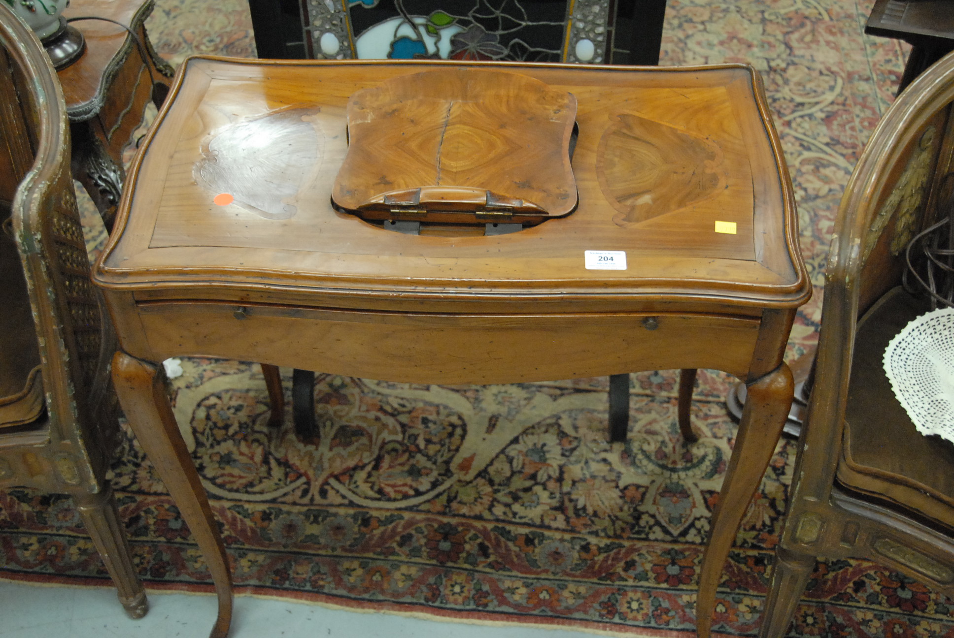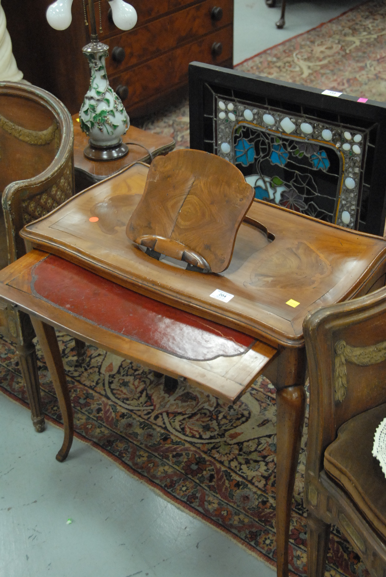 Lot 204: Louis XV style fruitwood writing table with drawer in end, pull slide, and book rest top, early 20th century. ht. 26 3/4in. wd. 27 1/4in. dp. 16in.