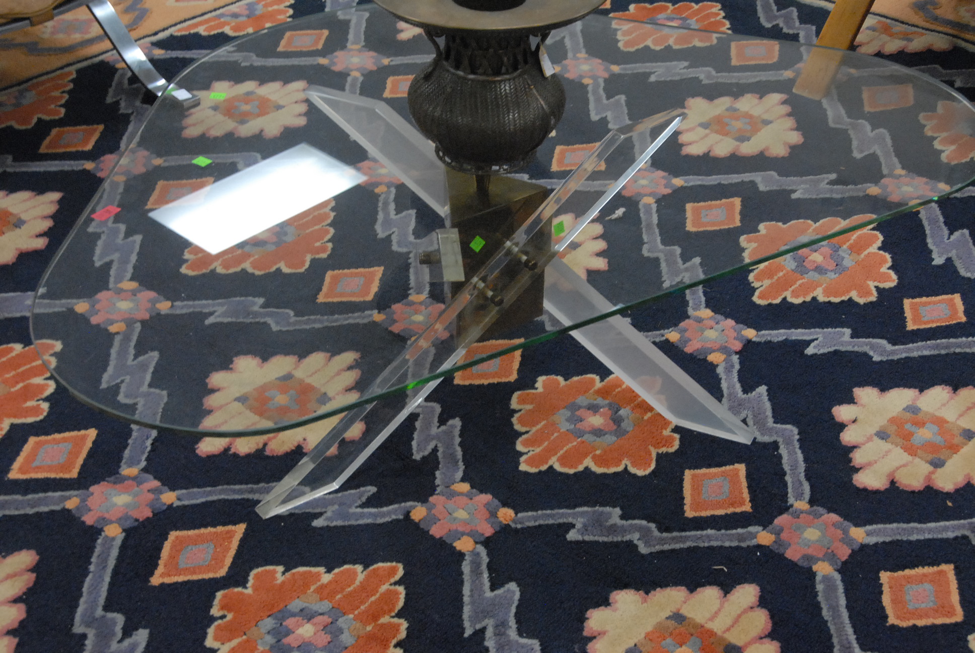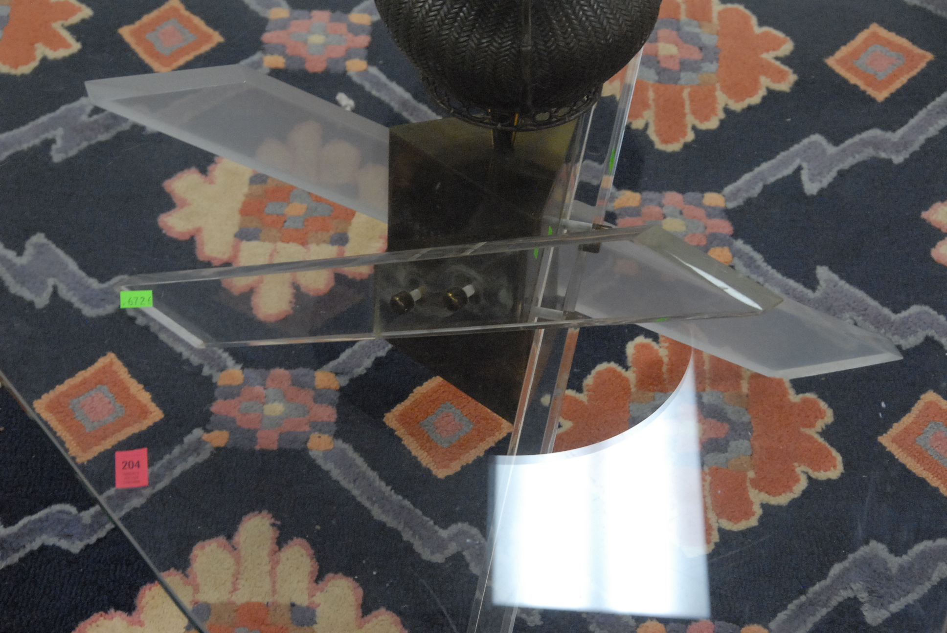 Lot 204: Lucite, brass, and glass coffee table attributed to Ben Karpen of NY having a base configured of three angled pieces of lucite joine…
