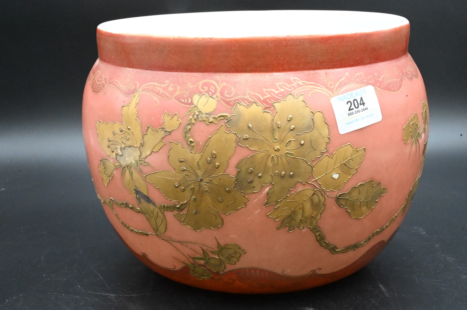 Mt. Washington Crown Milano Jardiniere, having raised gold flowers and leaves, marked with crown on bottom, height 10 inches, diameter 8 inches. Provenance: From the Estate of Elwyn W. Lemon, Enfield, Connecticut.