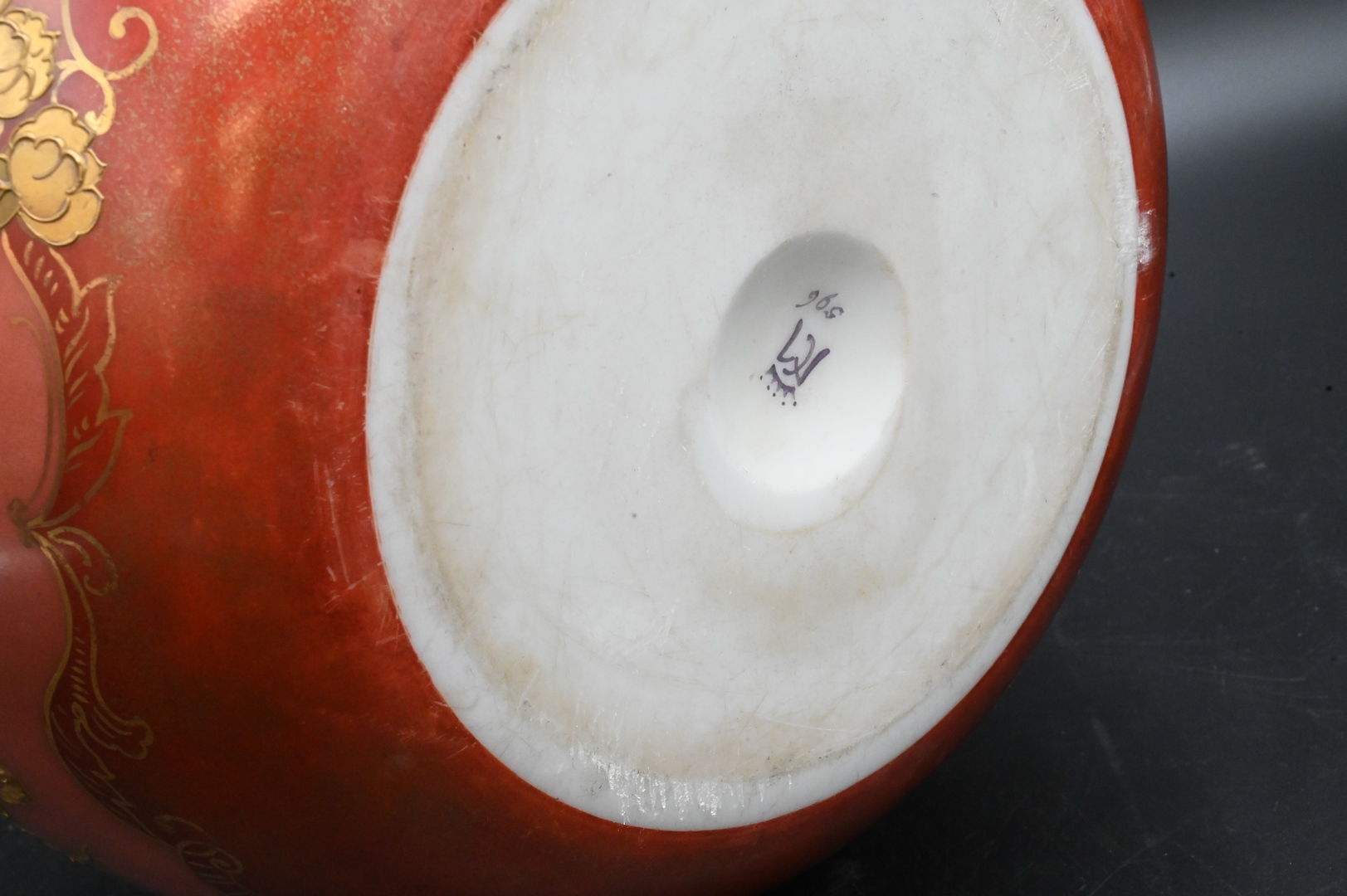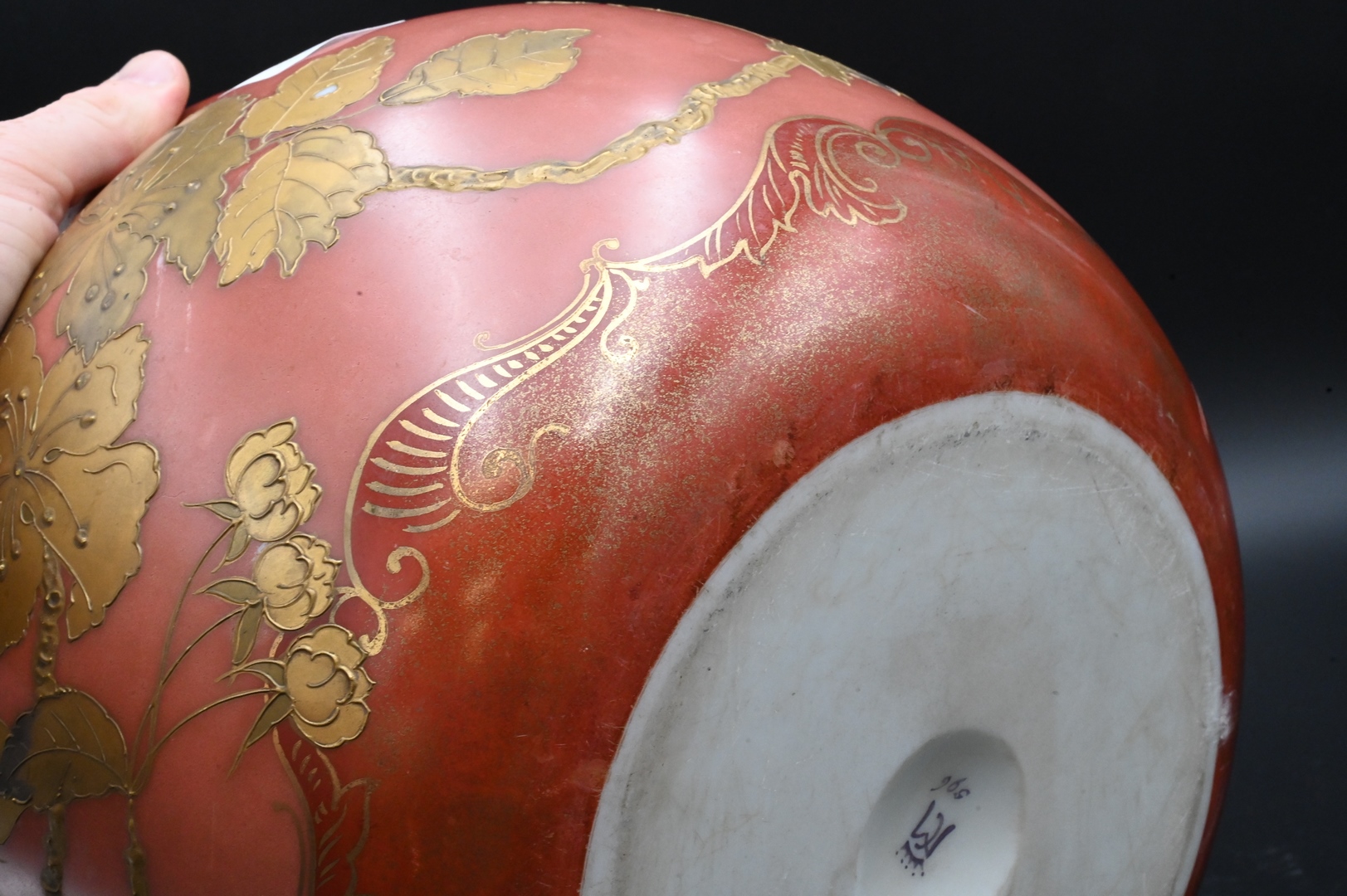 Good condition, minor wear to body and scratching to interior. Minor gilt loss to body, base is heavily scratched. Flowers with browning, 1 small flake to flower.