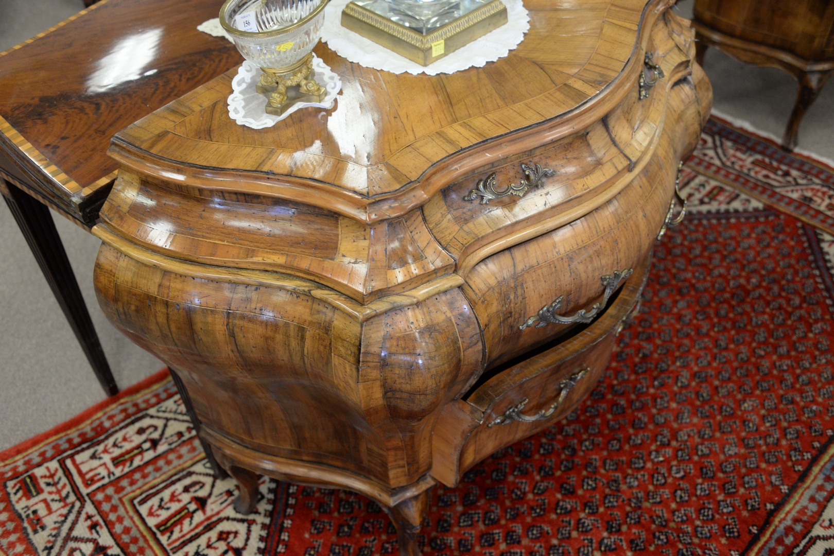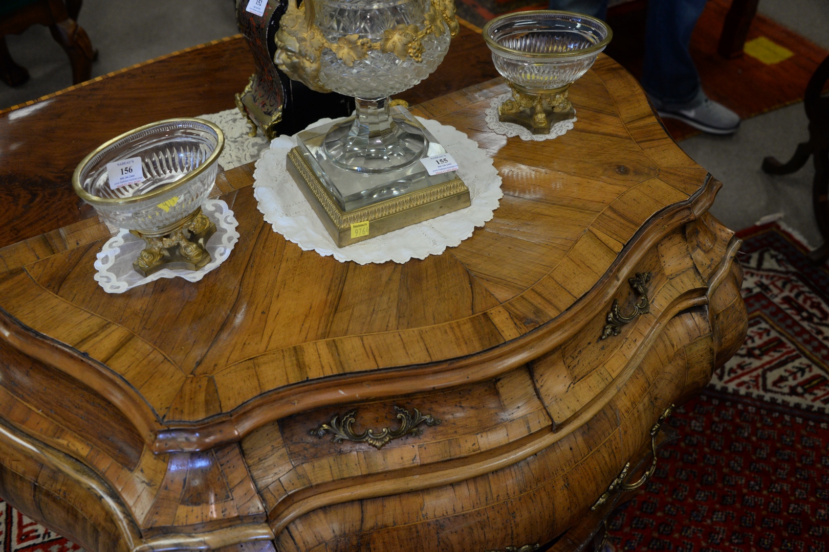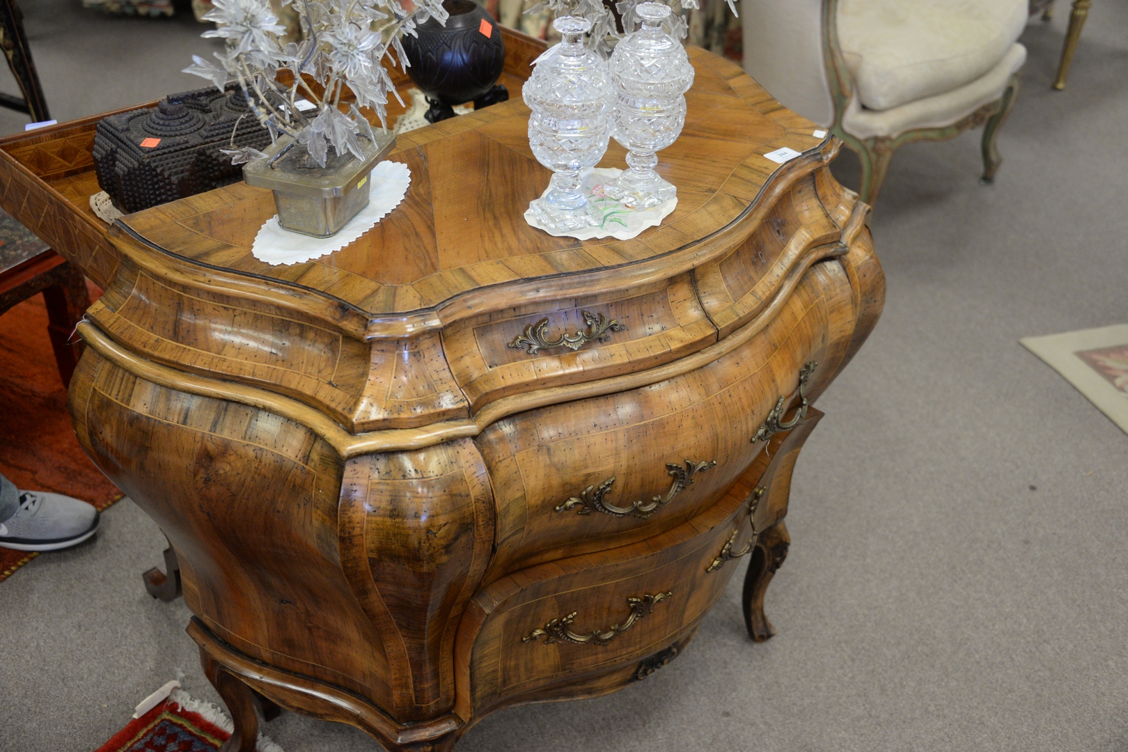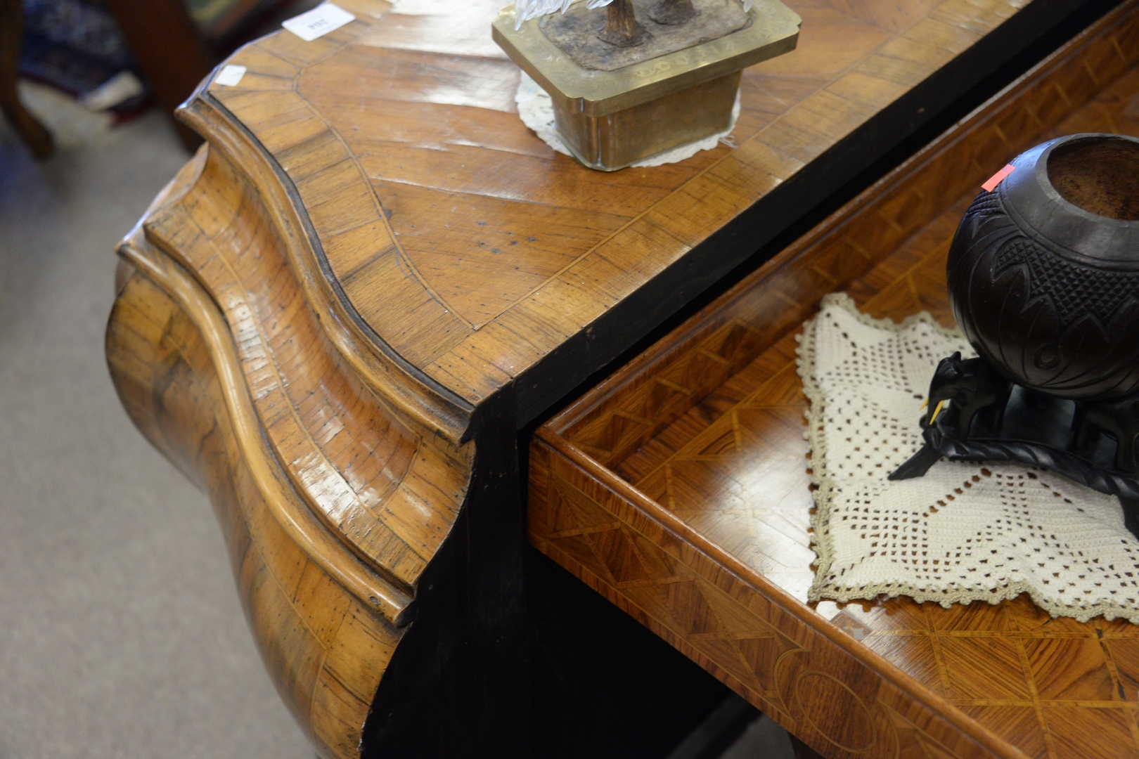 Lot 204: Pair Louis XV Style Inlaid Commodes, Bombay form, one brass missing, height 32 inches, width 39 inches.