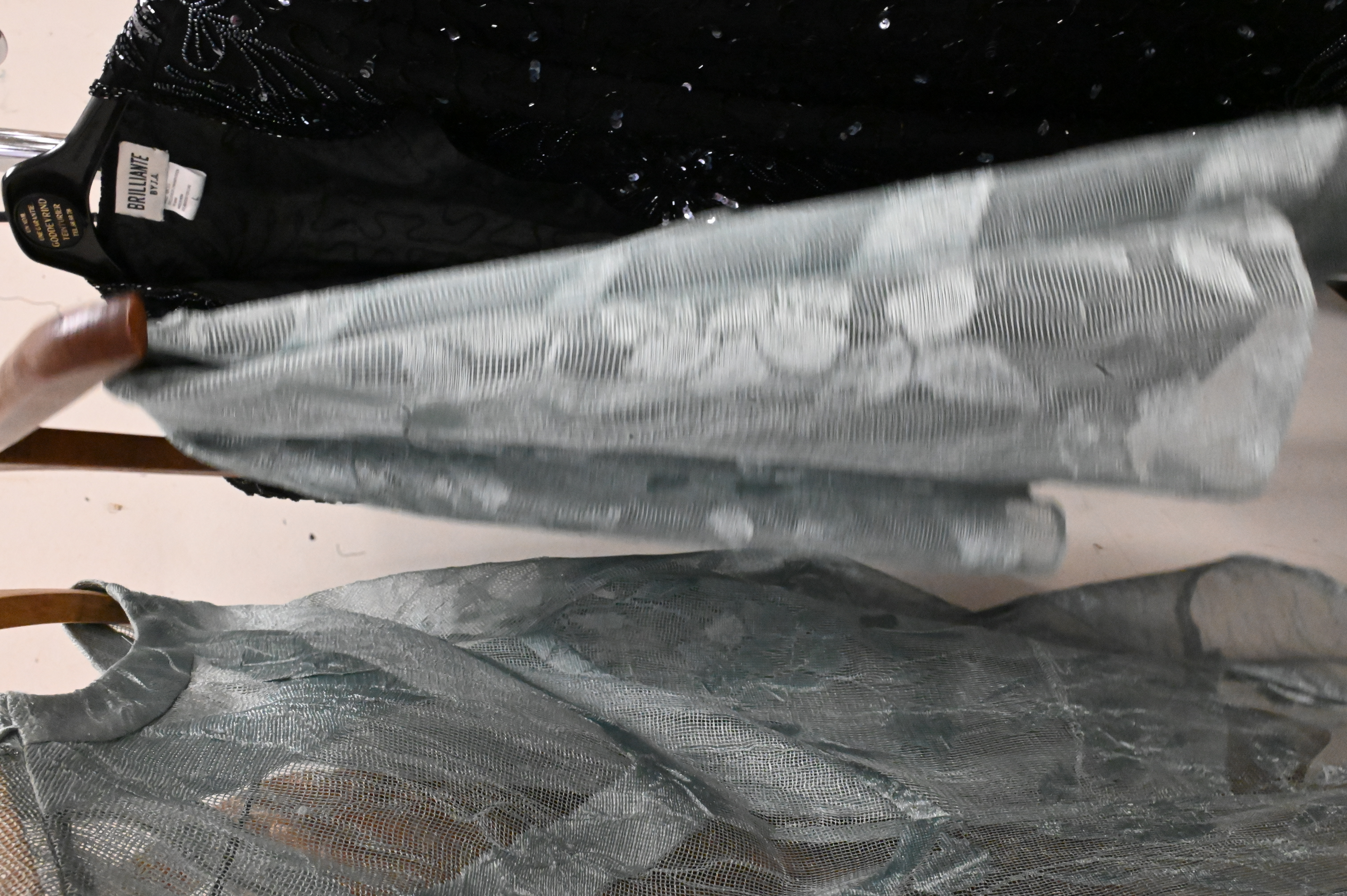 Six Piece Group of Women’s Formal Clothing, to include three vintage dresses, two sequined blazers, along with one skirt suit.
