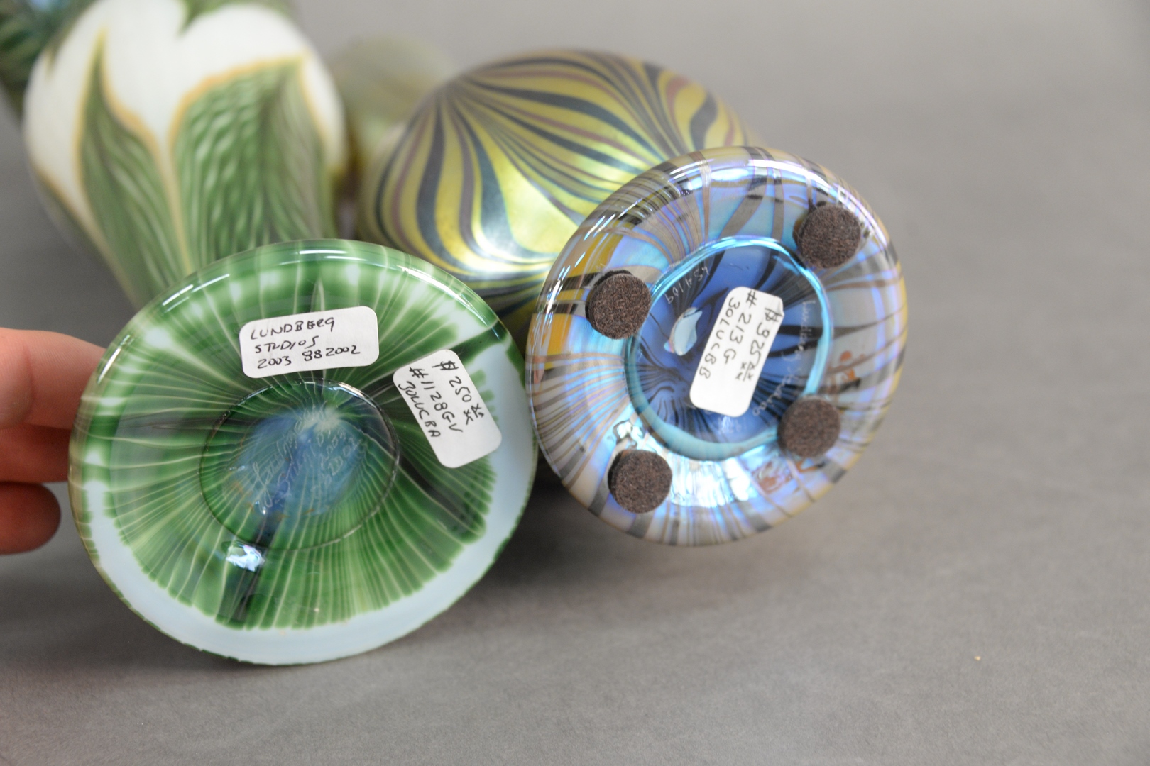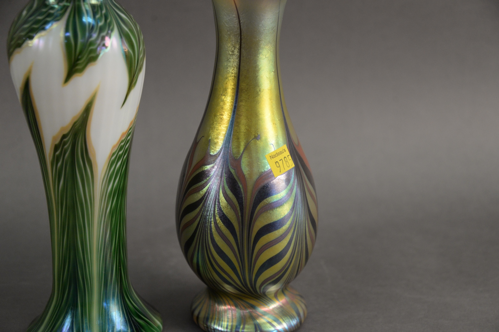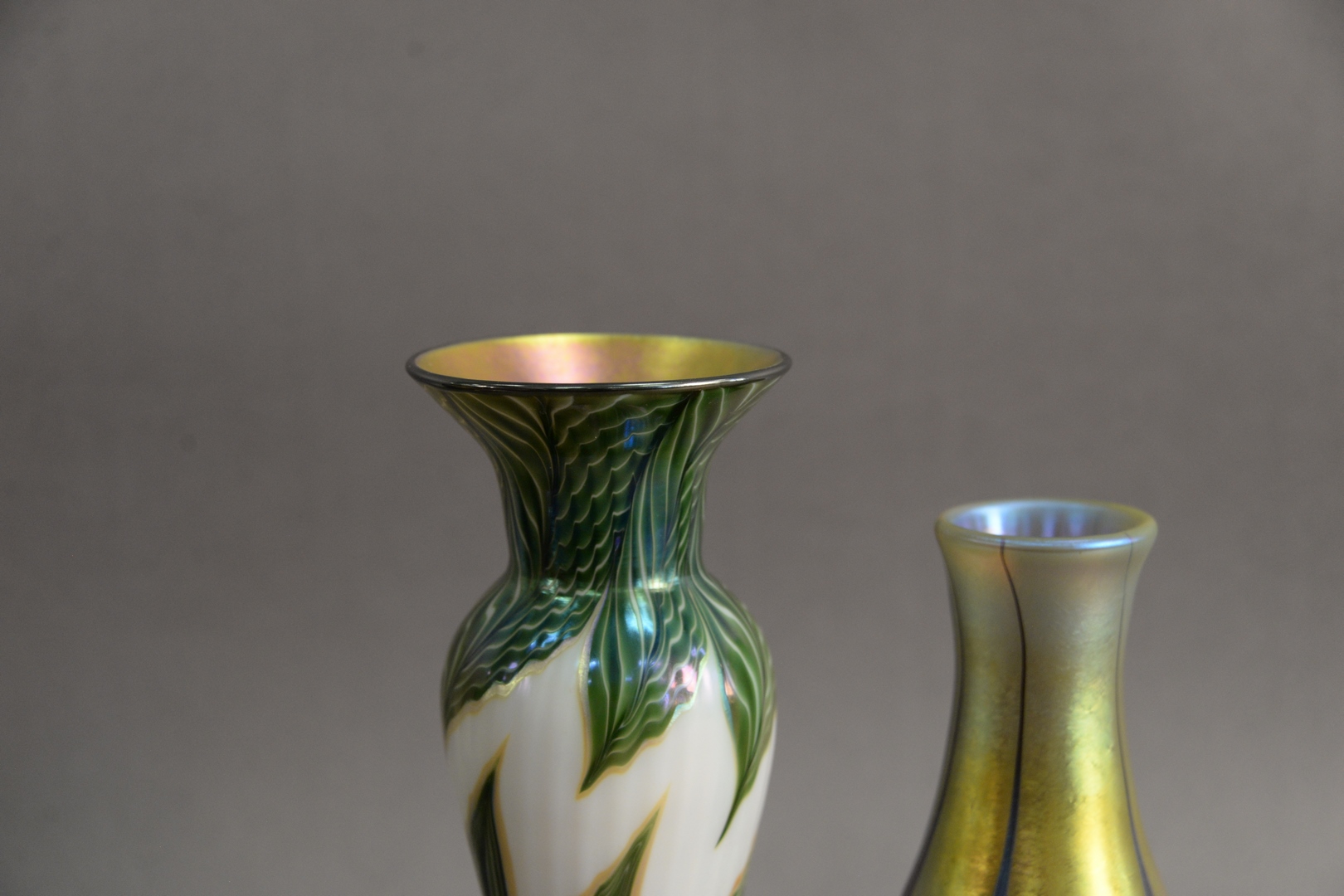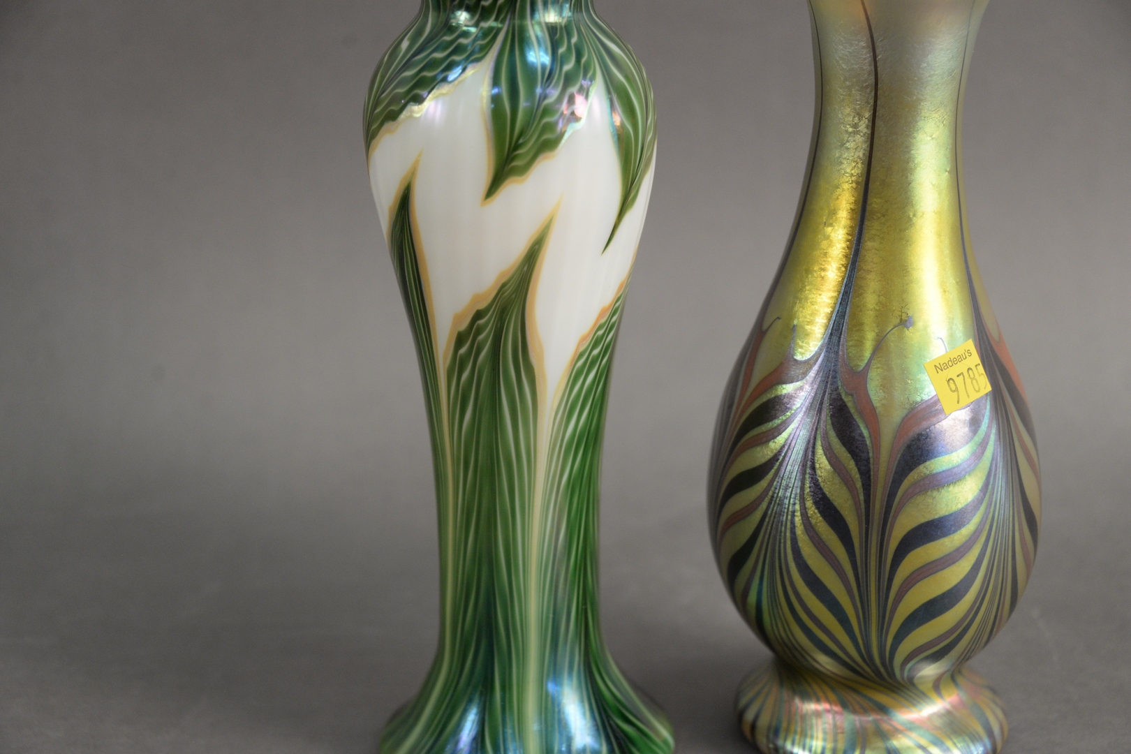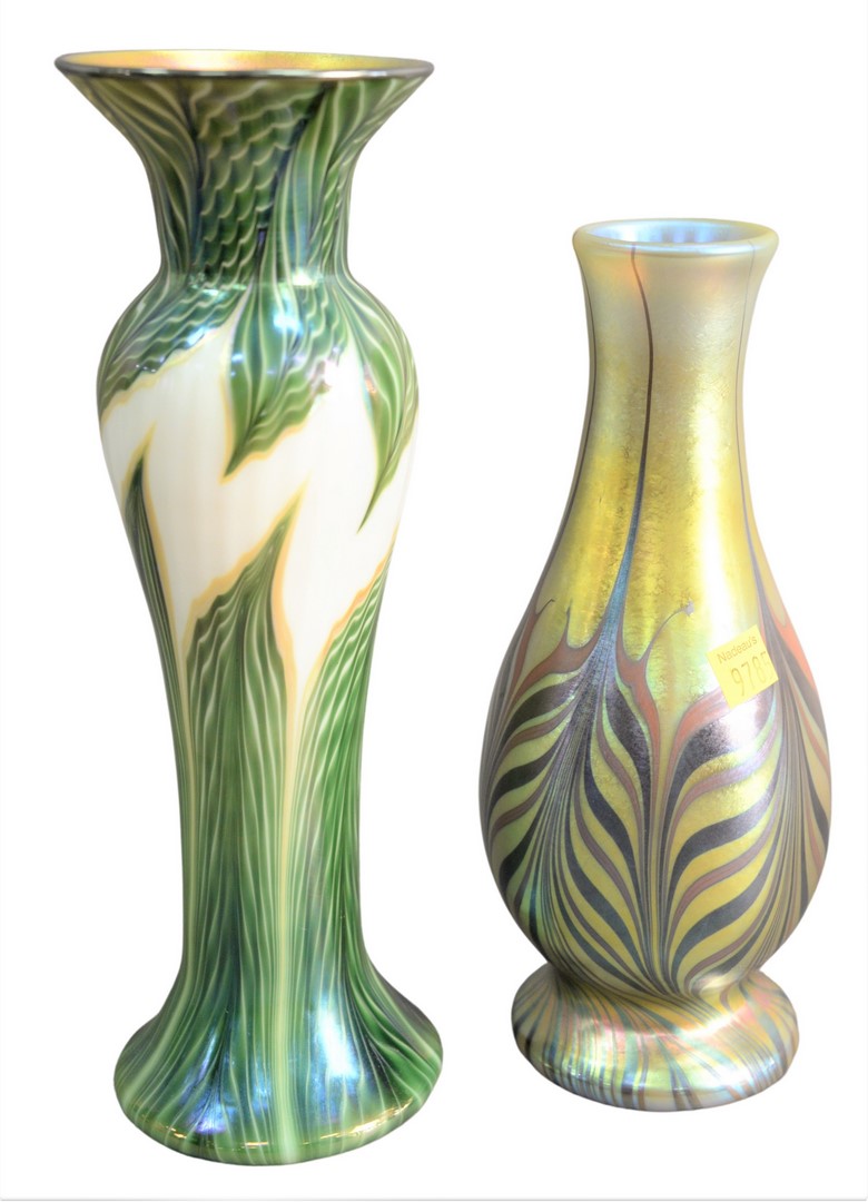Two Lundberg Art Glass Vases, heights 10 and 11 1/2 inches.