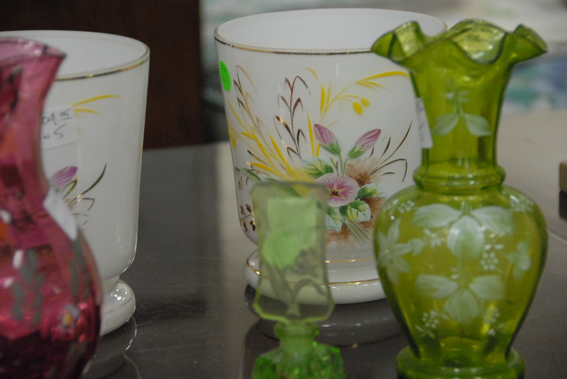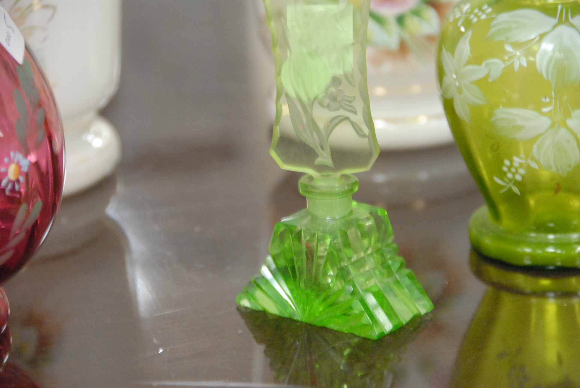 Five piece lot to include a perfume bottle, green vase, ruby red pitcher, and two Bristol glass vases.