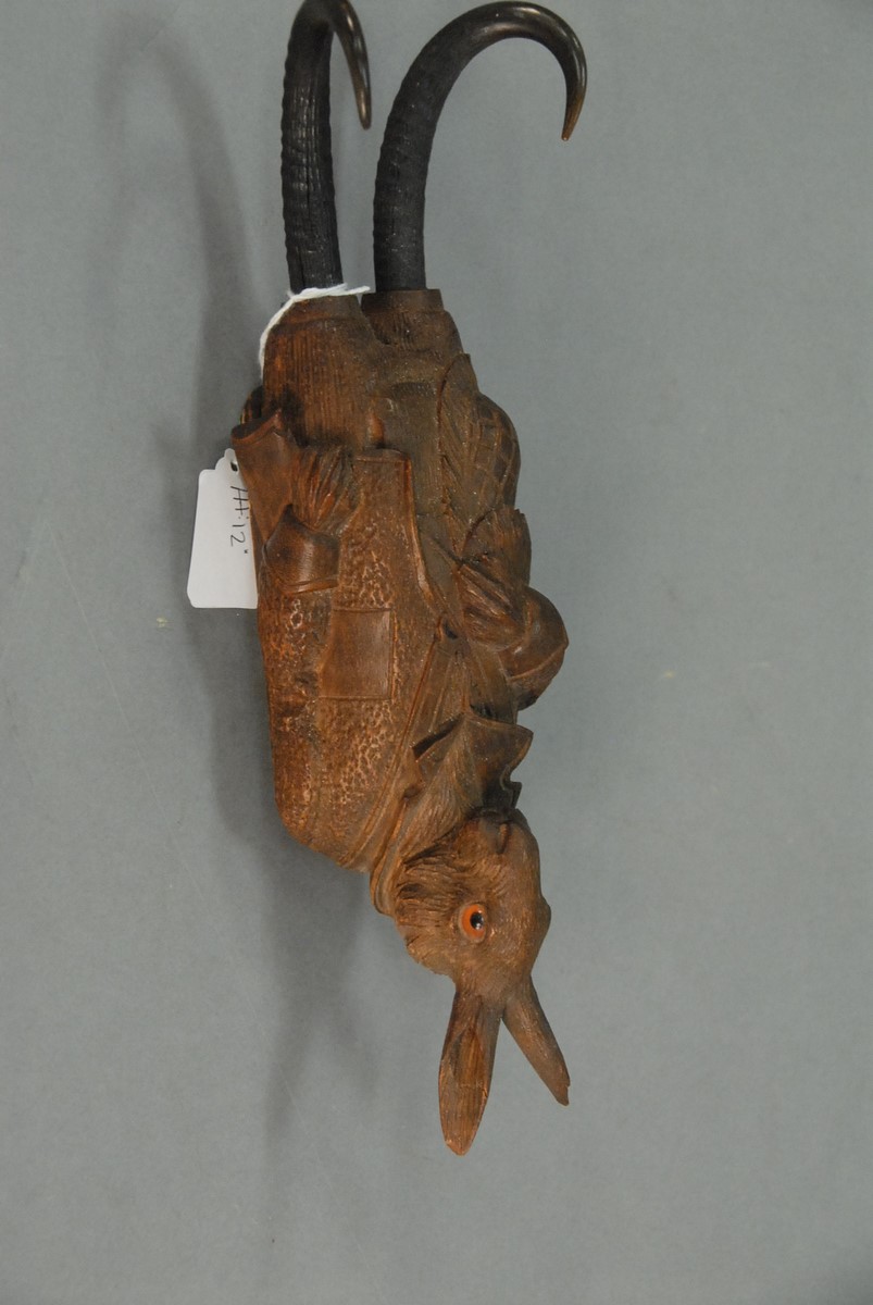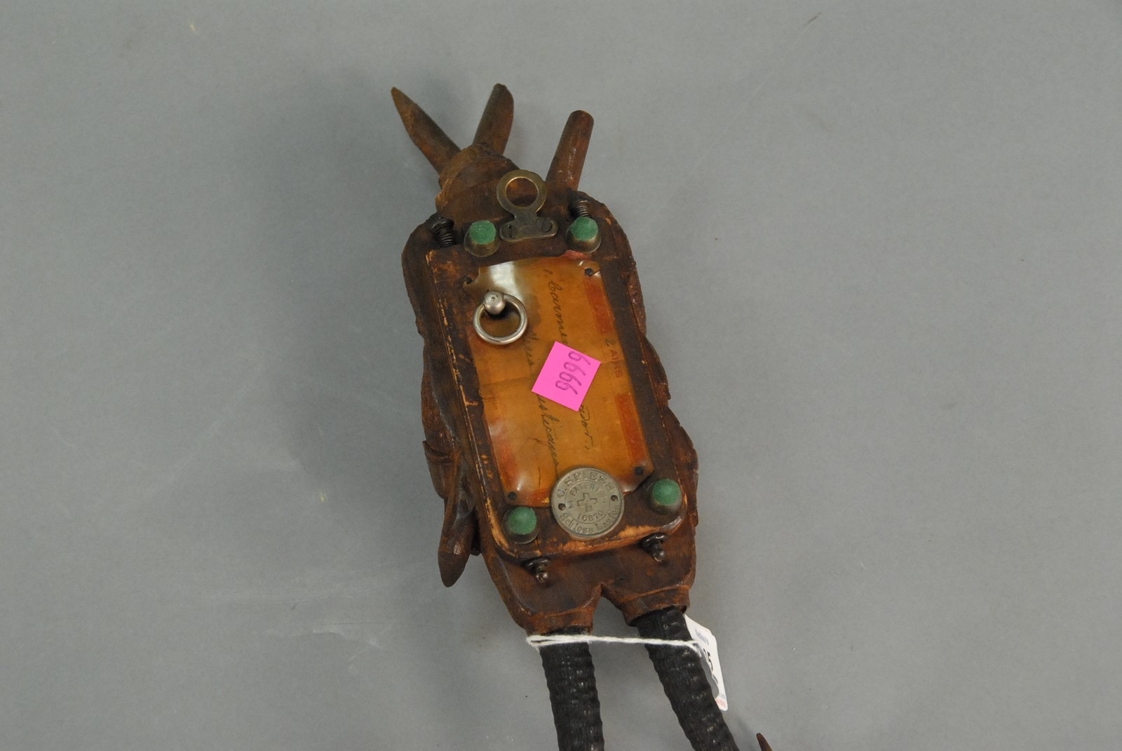 Lot 205: Black Forest musical coat hook, carved in the form of a rabbit with horn hooks and music box in back, C. Spiess Schloss Laufen 1887. ht. 12 in.
