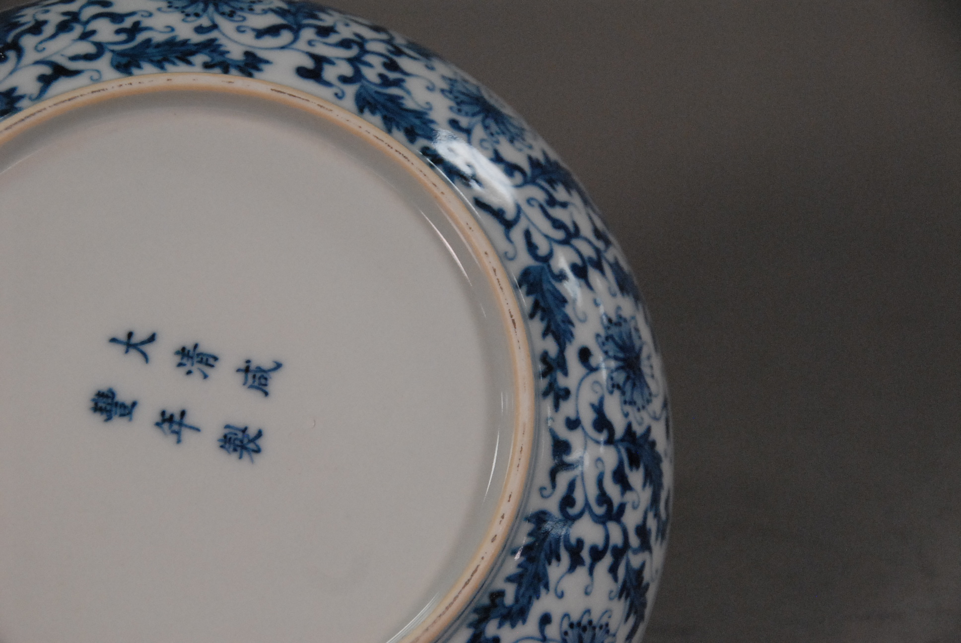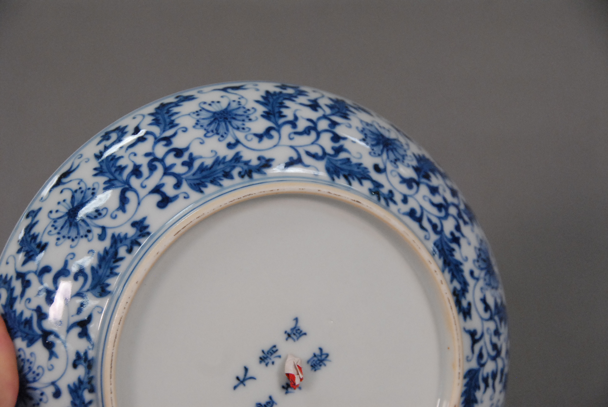 Blue and white lotus dish having painted lotus center interior and painted lotus around exterior.