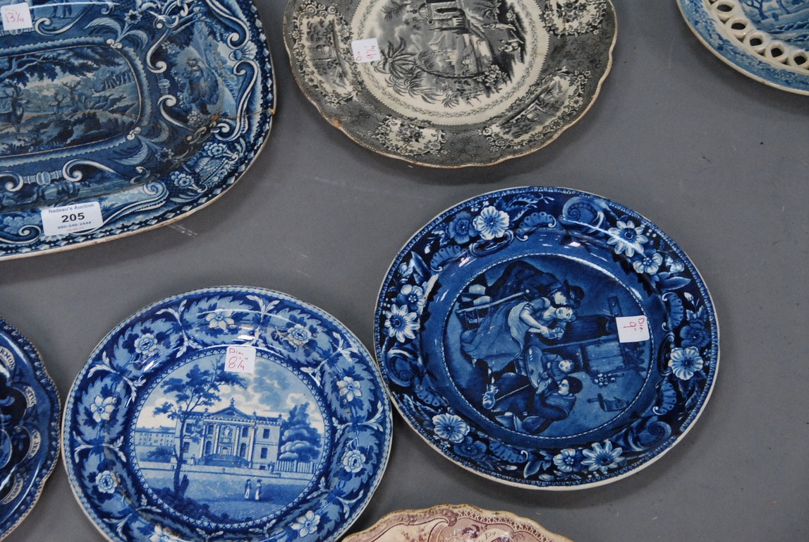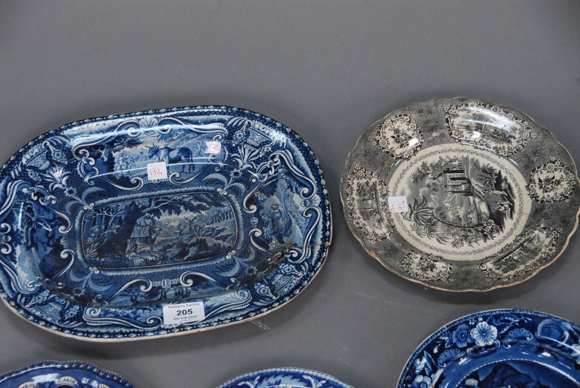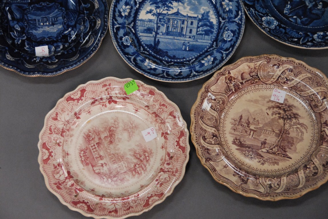 Lot 205: Eight piece lot of Staffordshire including teapot, plates, and Quadrupeds platter repaired.