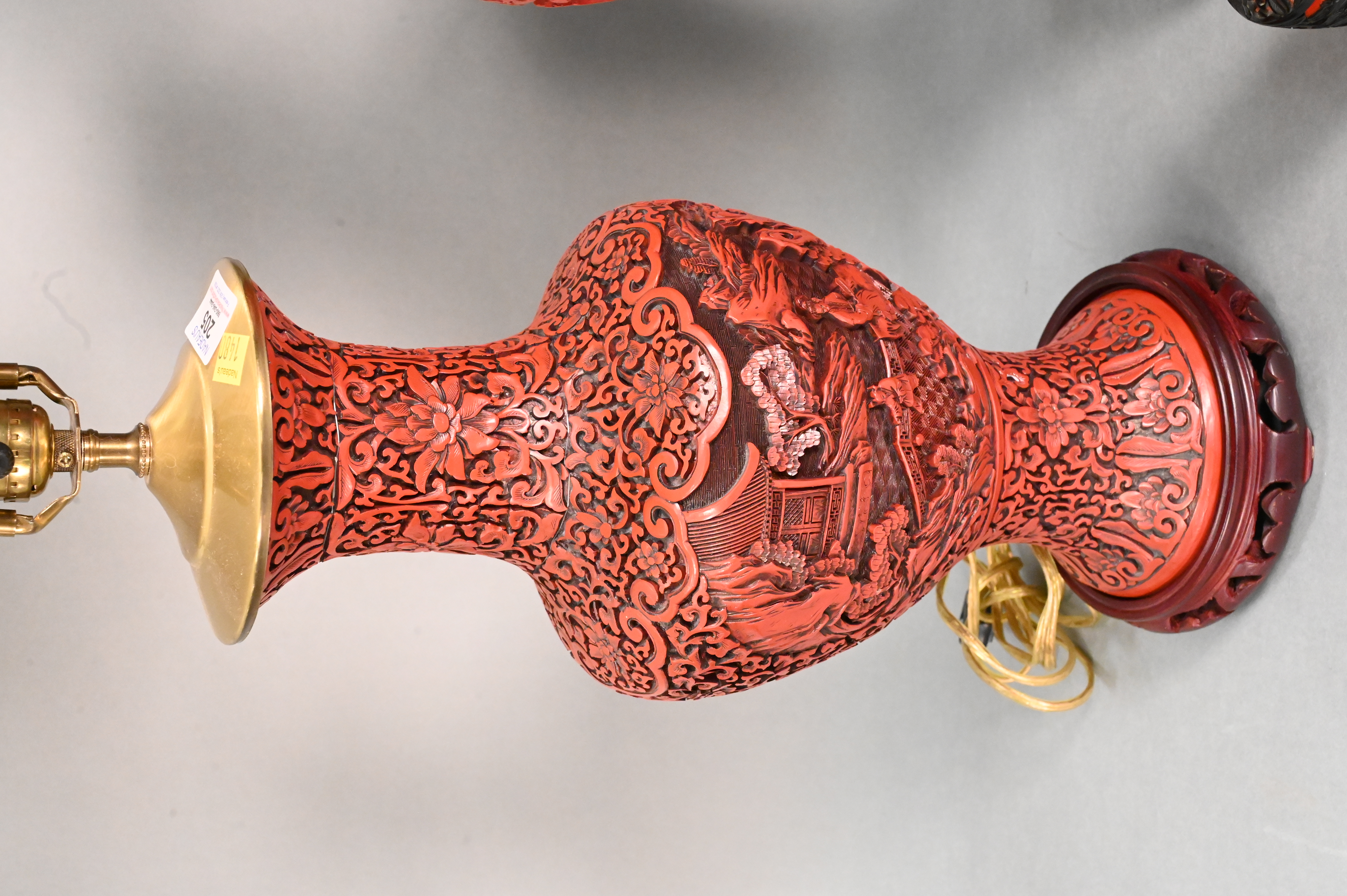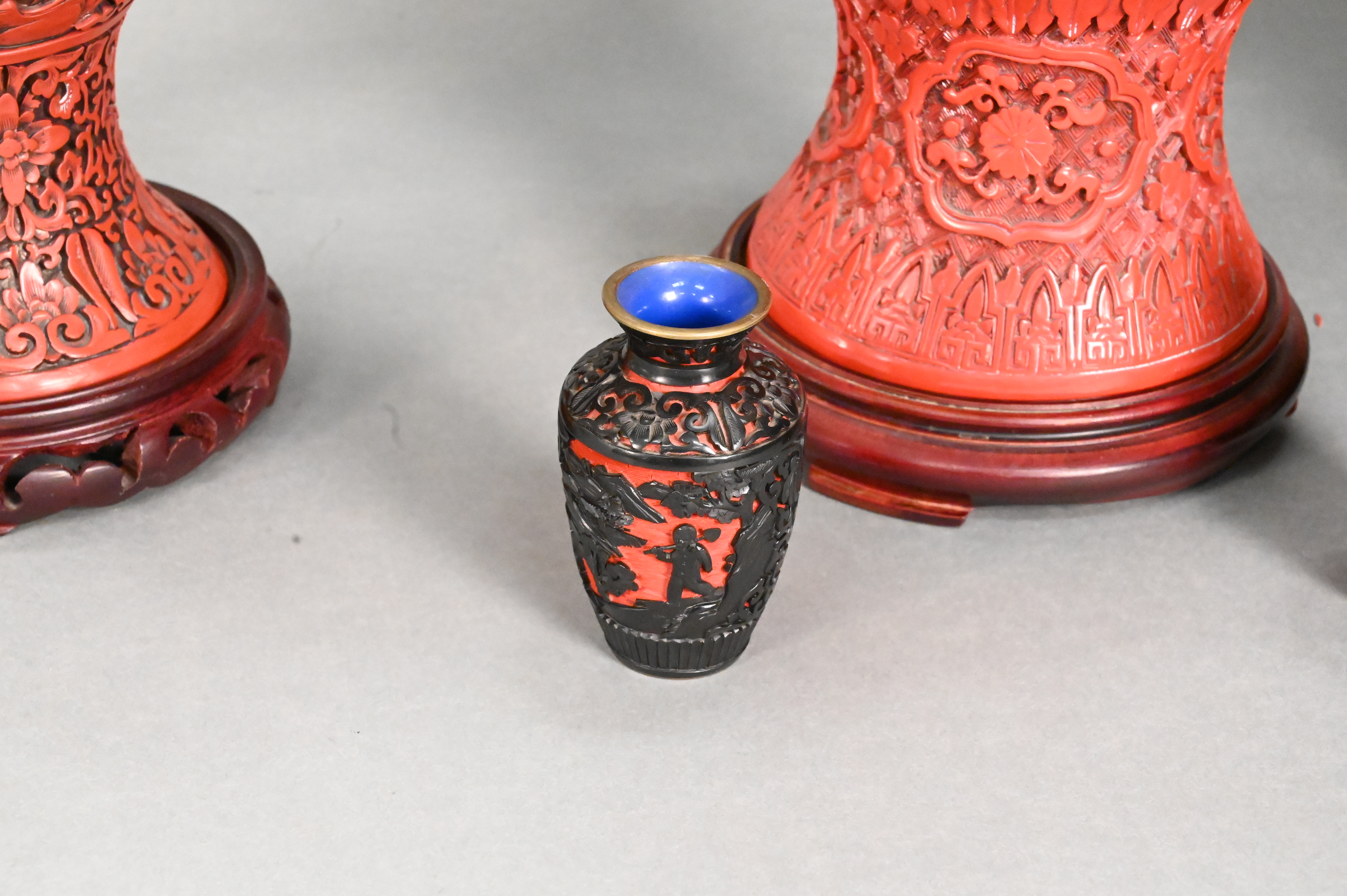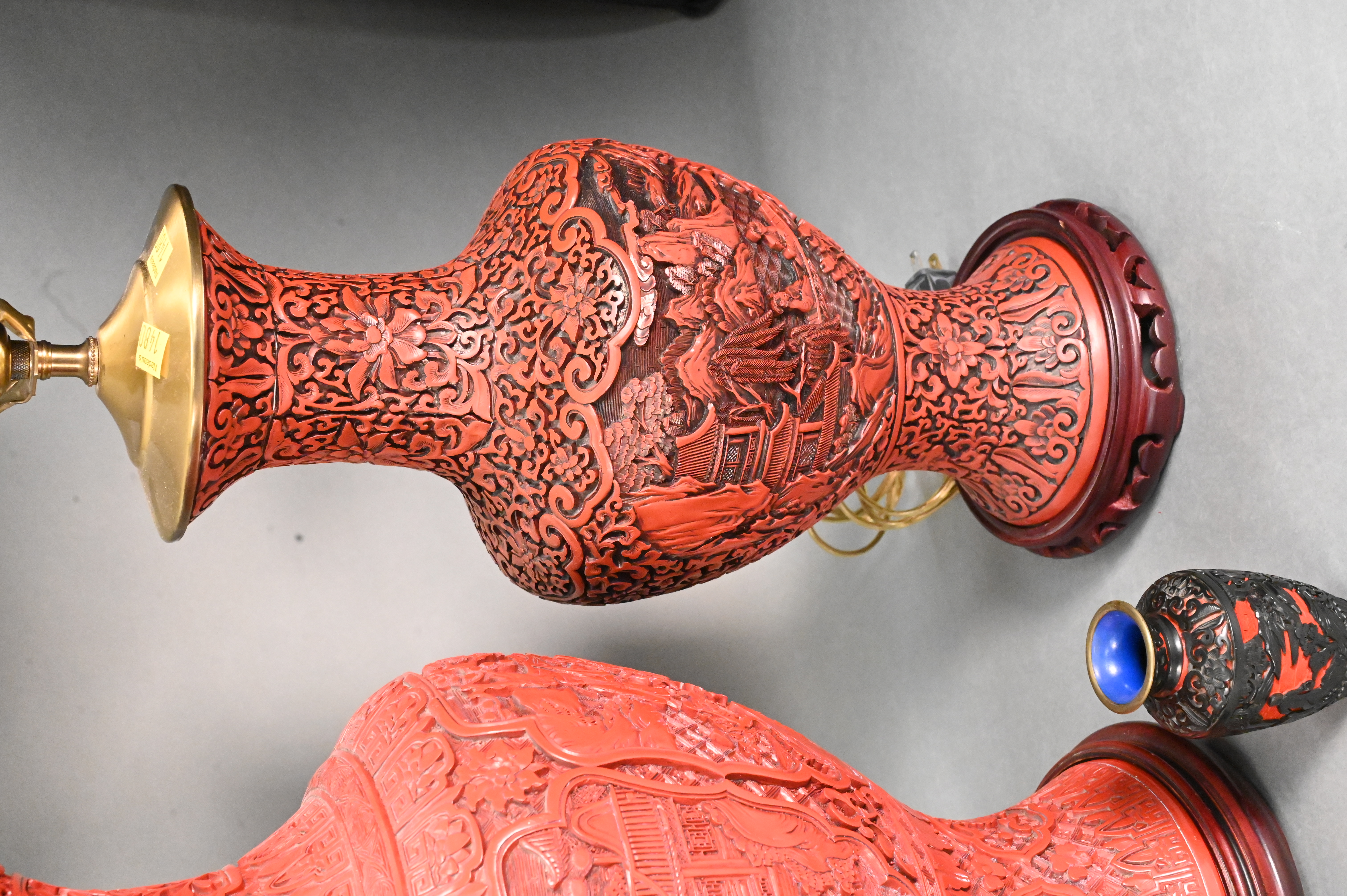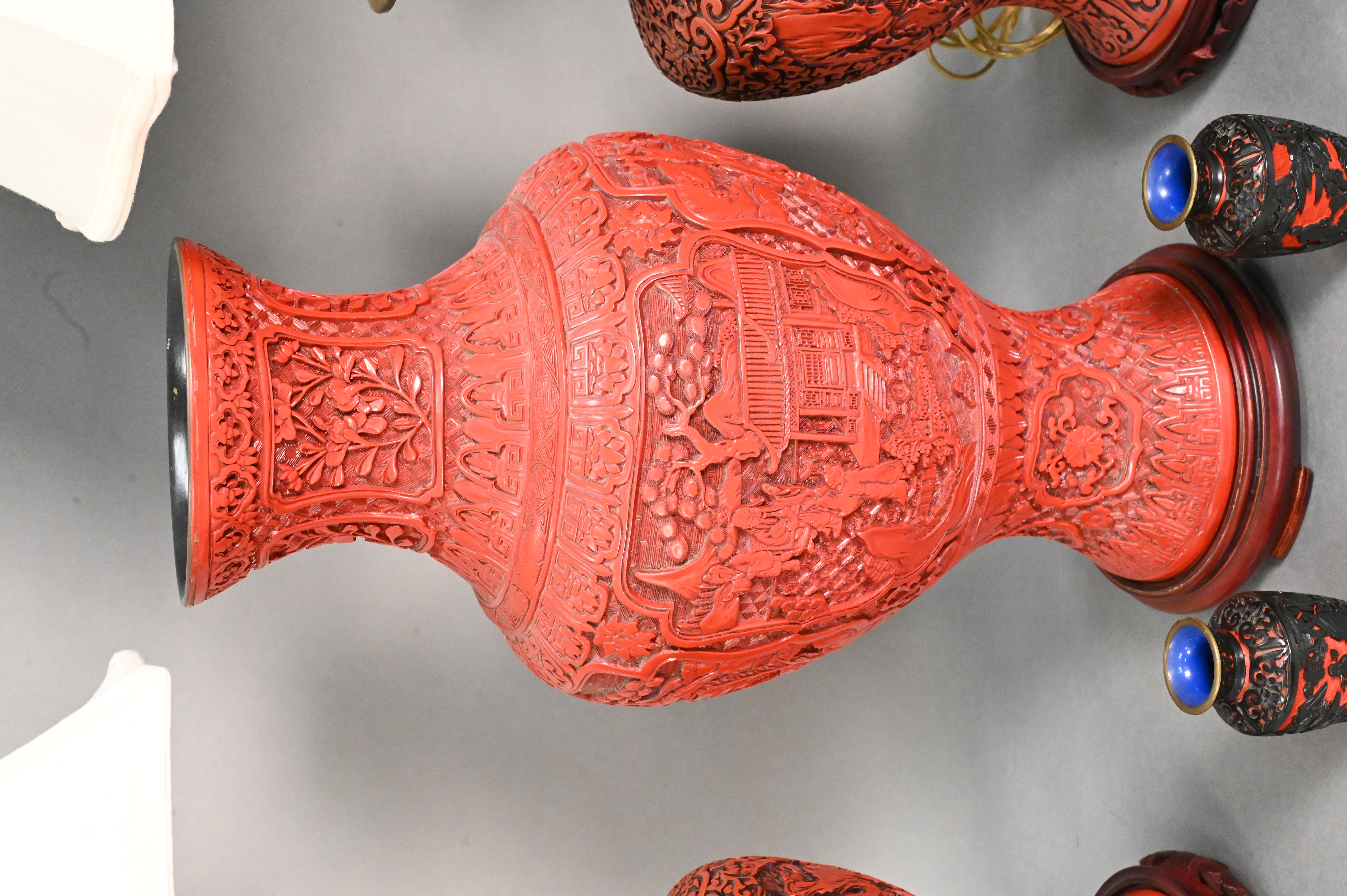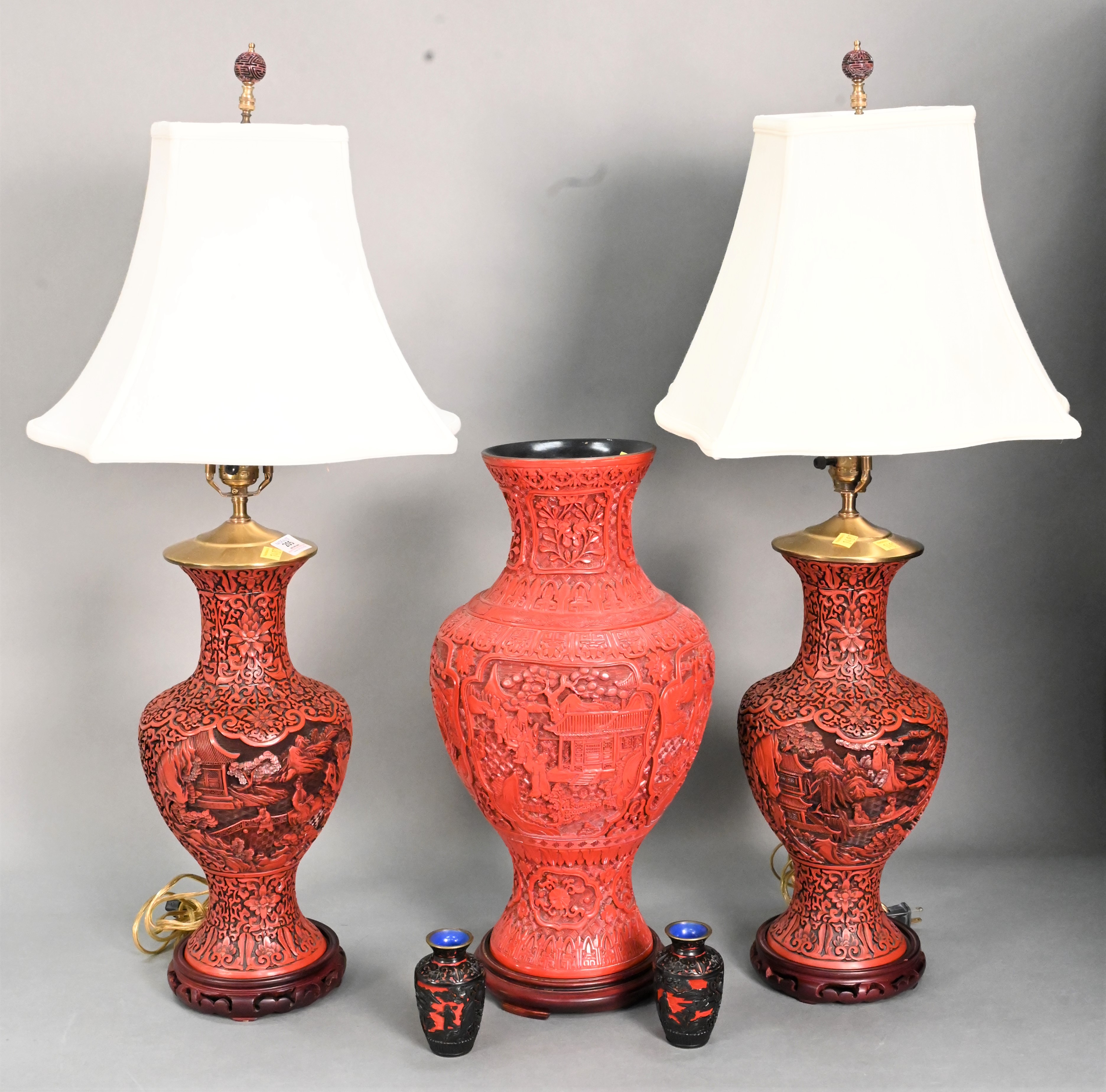 Five Large Cinnabar Vases, to include two having landscape scene, made into lamps, total height 33 inches, a pair of cinnabar bud vases, height 4 inches, along with a red lacquer having panels, height 18 inches.