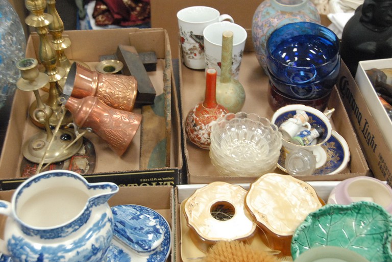 Four box lots of glass, china, Lenox, bowls, Wedgwood vase, desk set, two Oriental vases, etc.