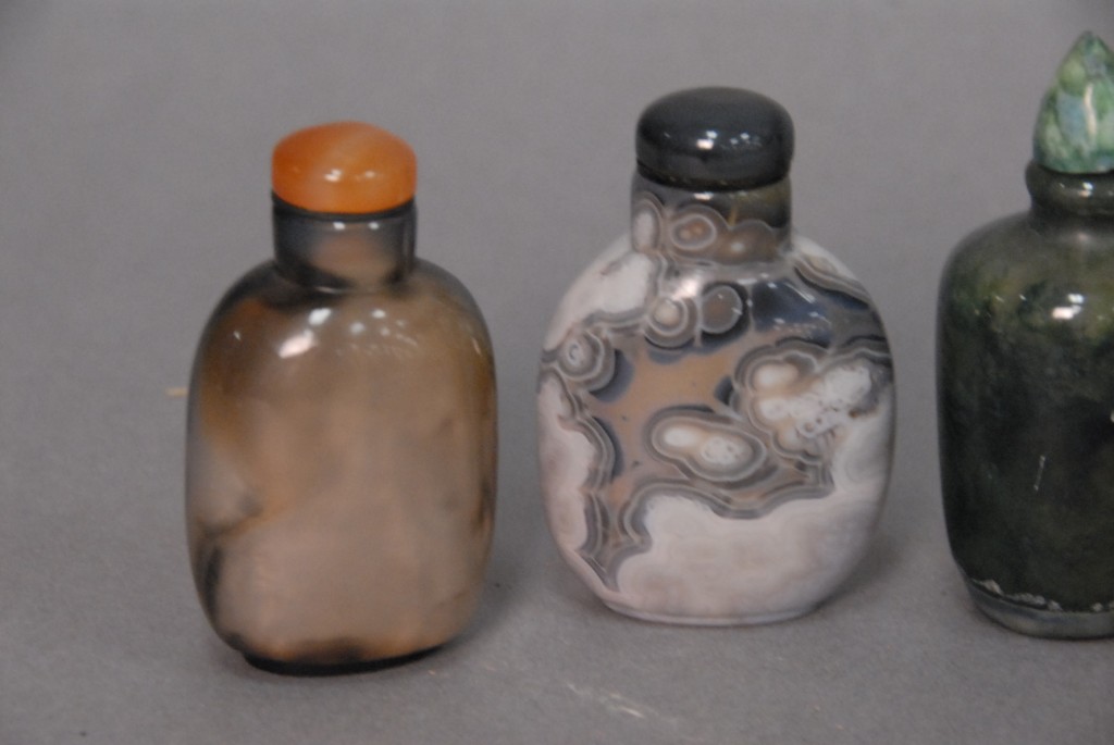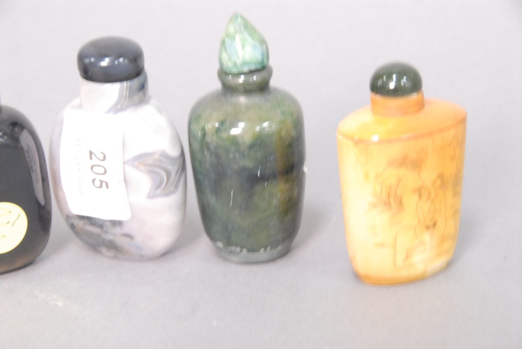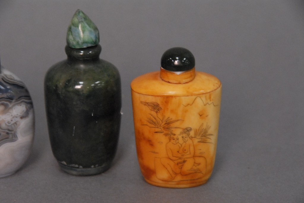 Lot 205: Group of four snuff bottles to include two agate, one hardstone and one bone with erotic scene, all about 3