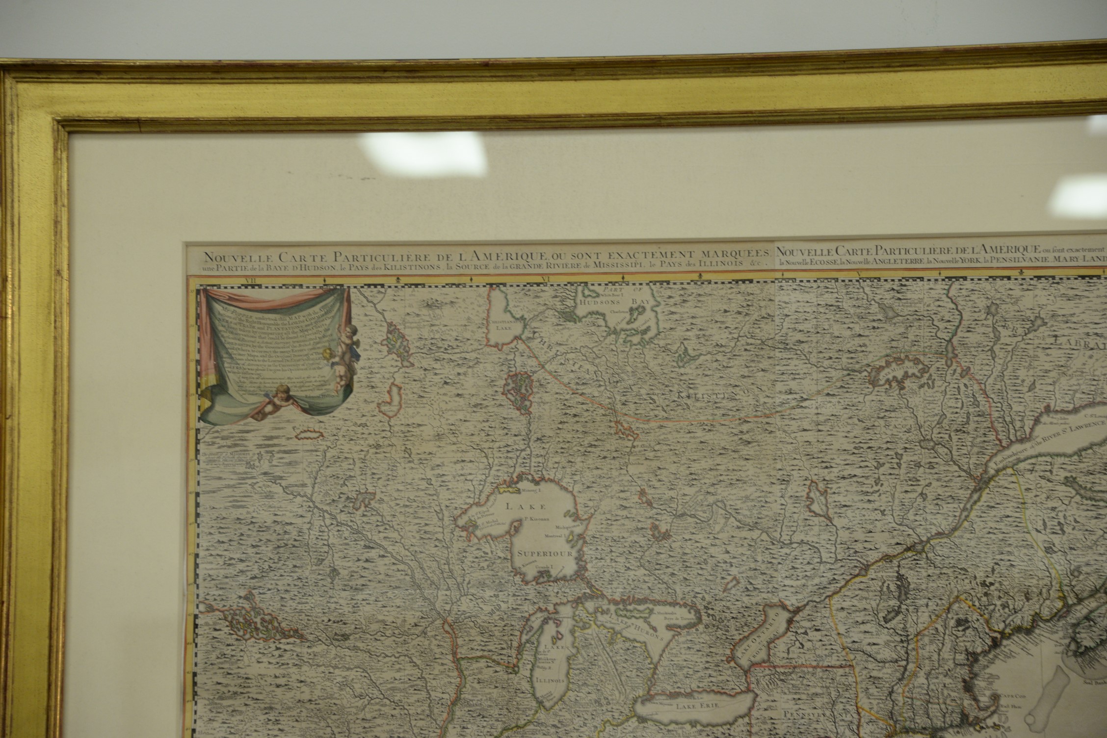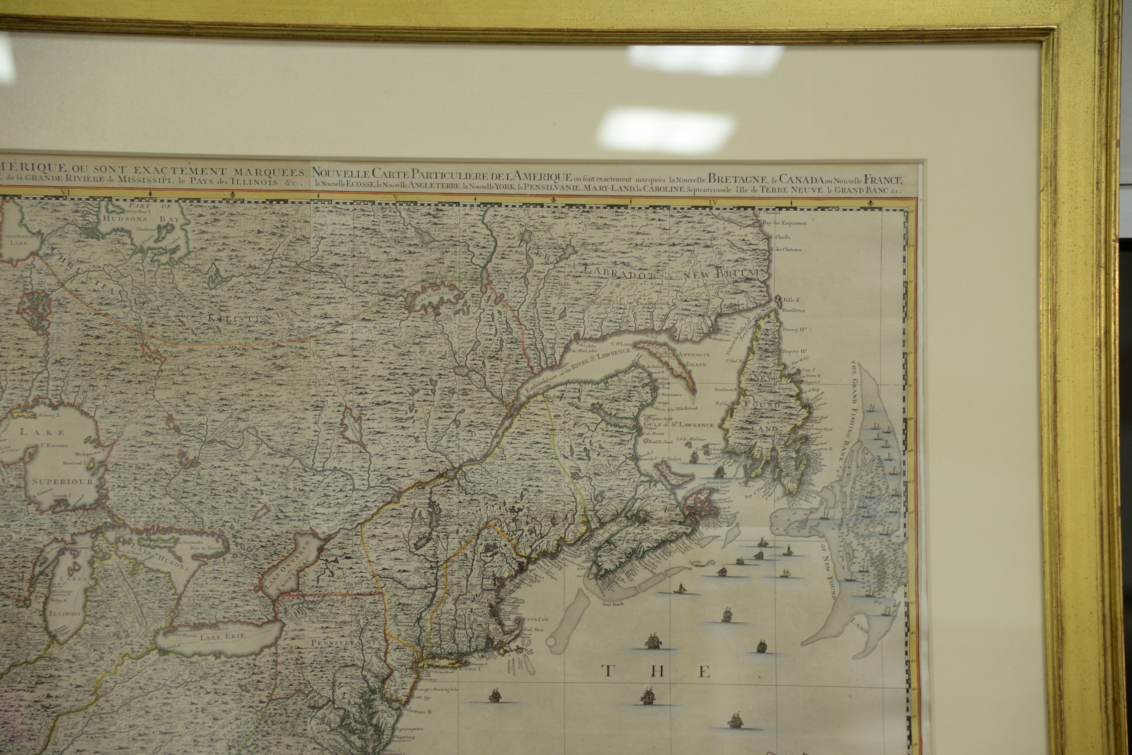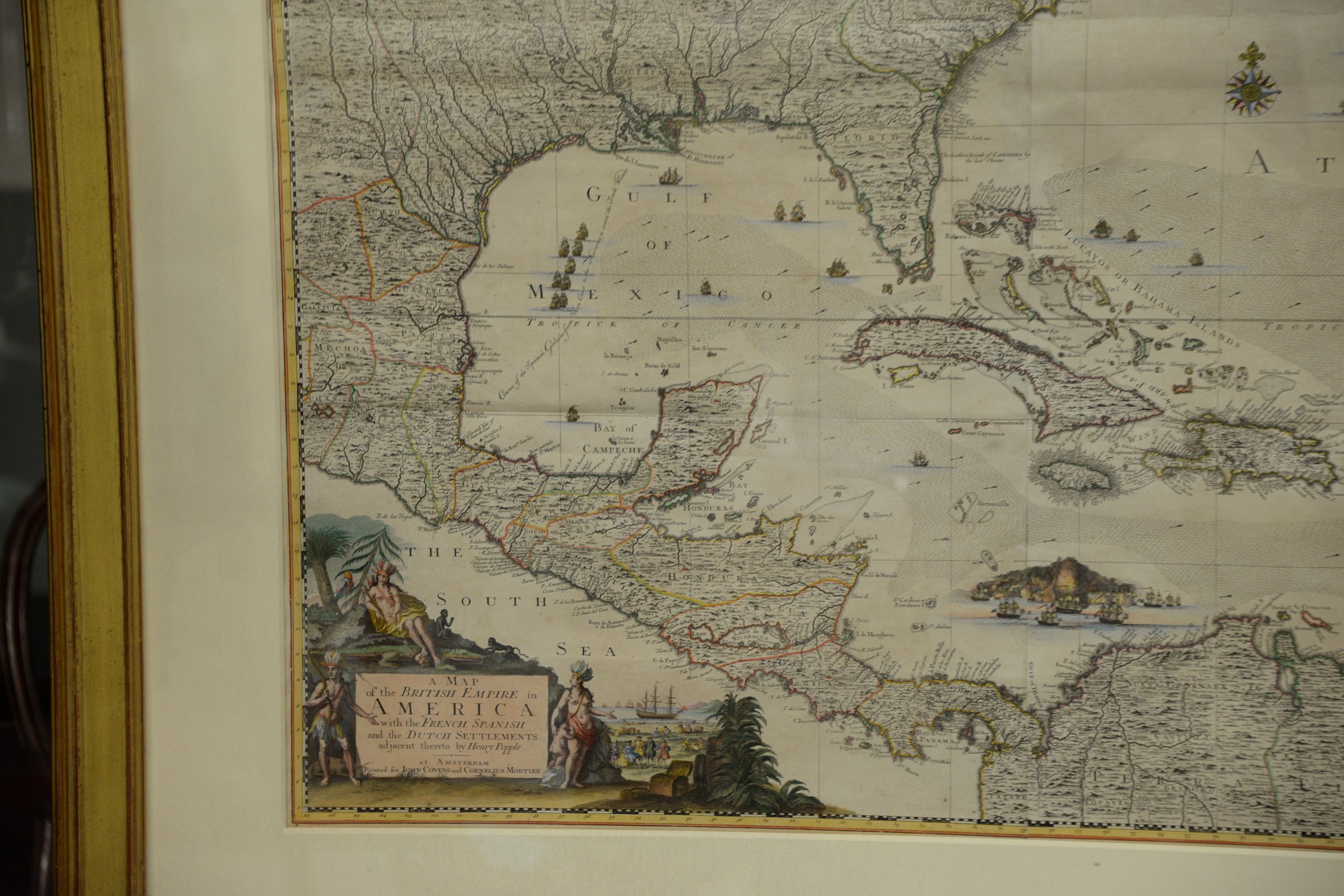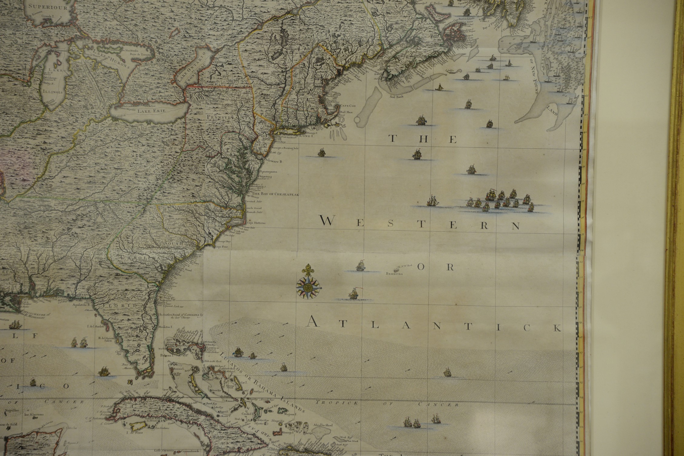 Henry Popple, North America colored map, A map of the British Empire in America with the French, Spanish and the Dutch Settlements, Adjacent thereto by Henry Popple at Amsterdam, printed for John Covens and Cornelius Mortier, large wall map in four joined sheets, narrow margins, Nouvelle Carte Particuliere De L’Amerique, The Western or Atlantick. 44 3/4 x 40 1/2 sight size Provenance: Property from Credit Suisse’s Americana Collection
