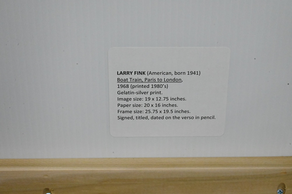 Larry Fink (American, born 1941), Boat Train, Paris – London, 1968 (printed 1980’s), gelatin-silver photograph, signed, titled and dated on the verso in pencil, artwork 19″ x 12 3/4″; paper sheet 20″ x 16″; frame 25 3/4″ x 19 1/2″. Provenance: An estate from Redding, CT.
