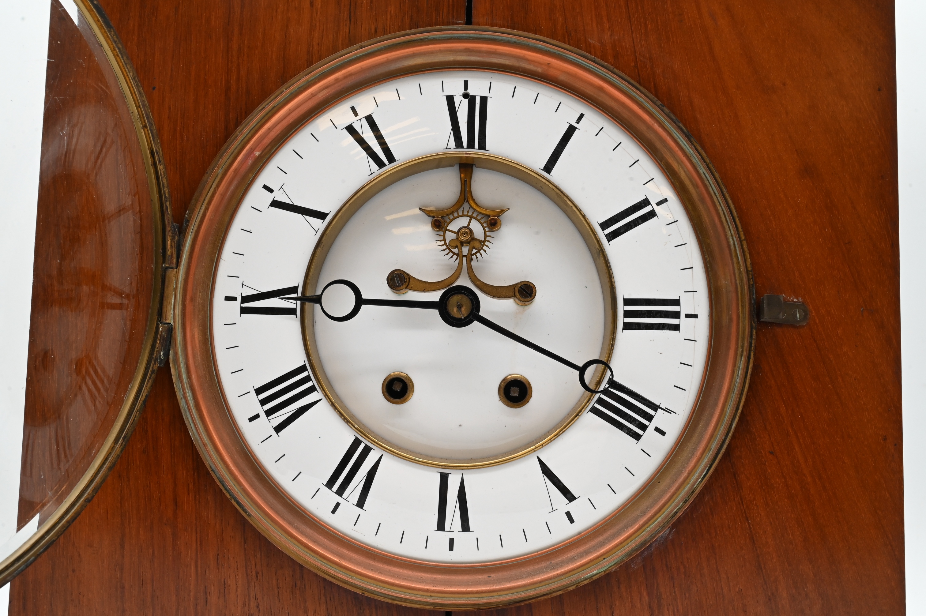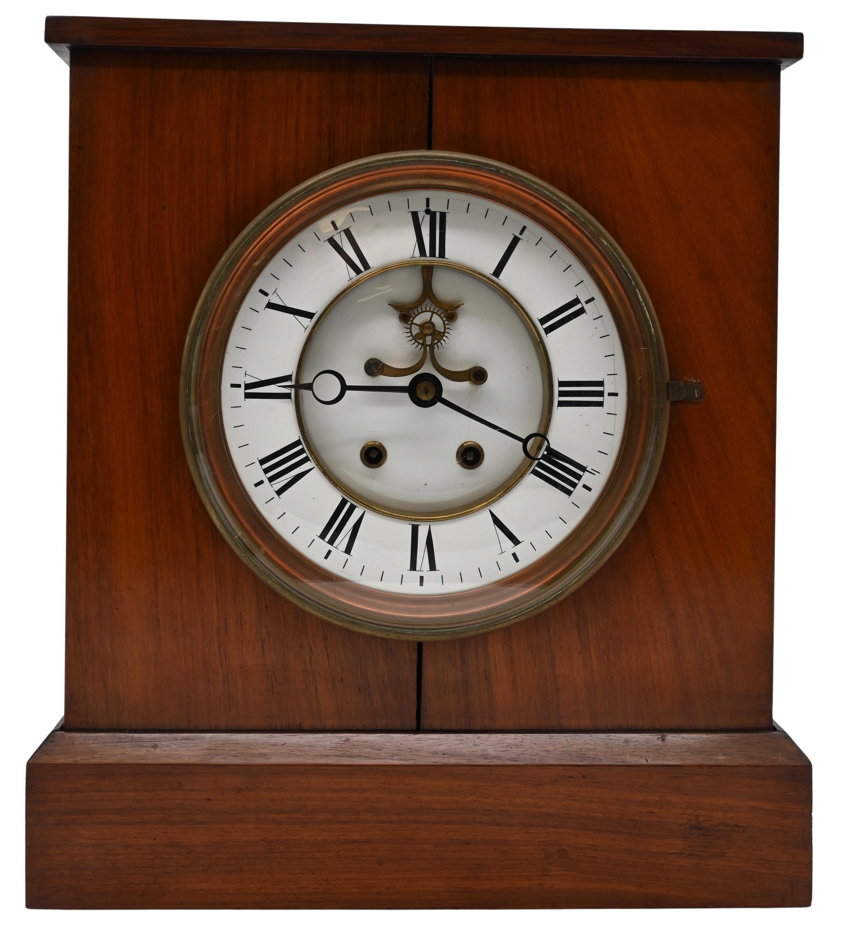 mahogany cased shelf clock with painted Roman numeral dial, brass works movement with open escapement, key-wound, housed in a plain rectangular case with brass bezel and hinged front door.