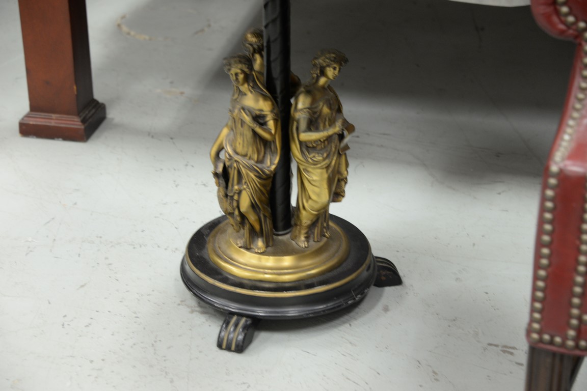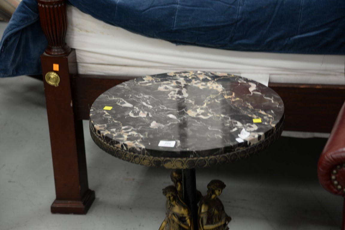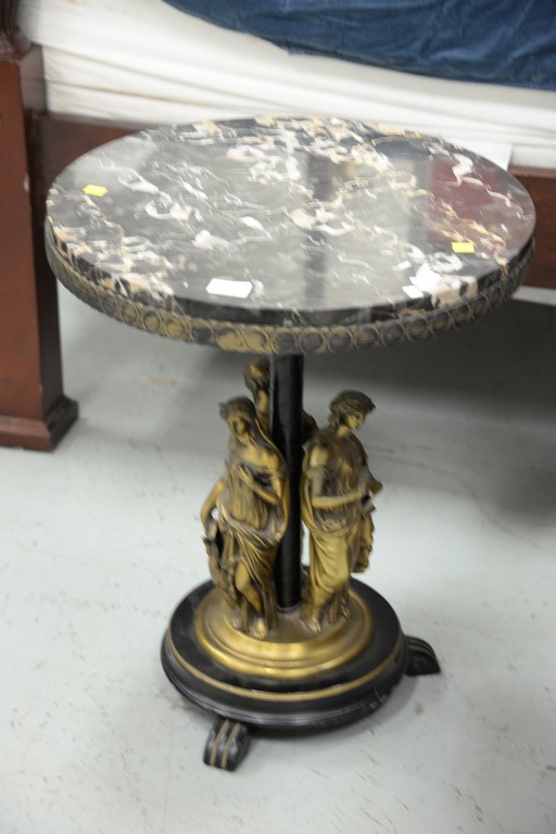 Marble top table with triple figure white metal base, ht. 24in., dia. 20 in.