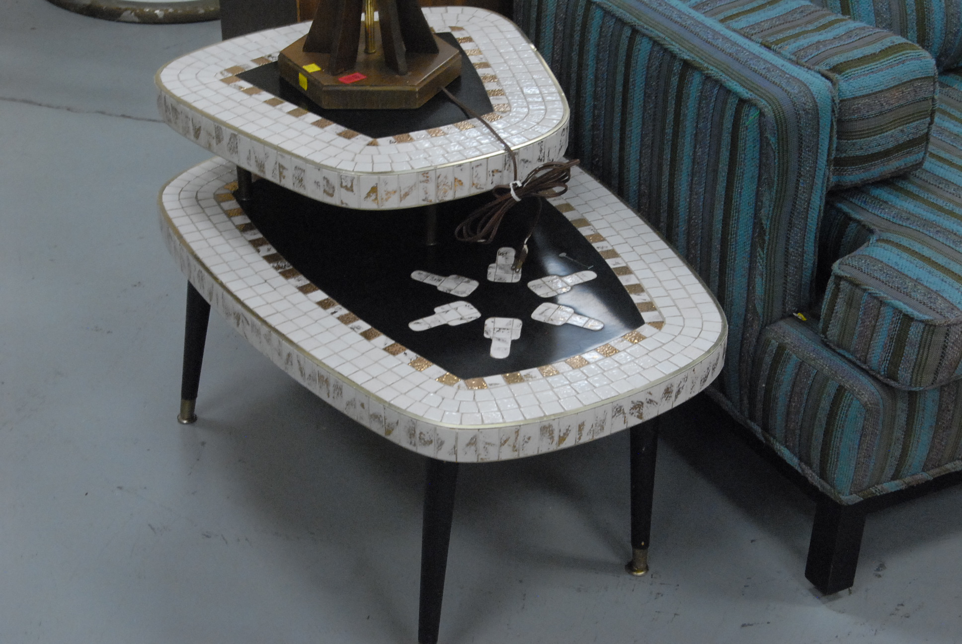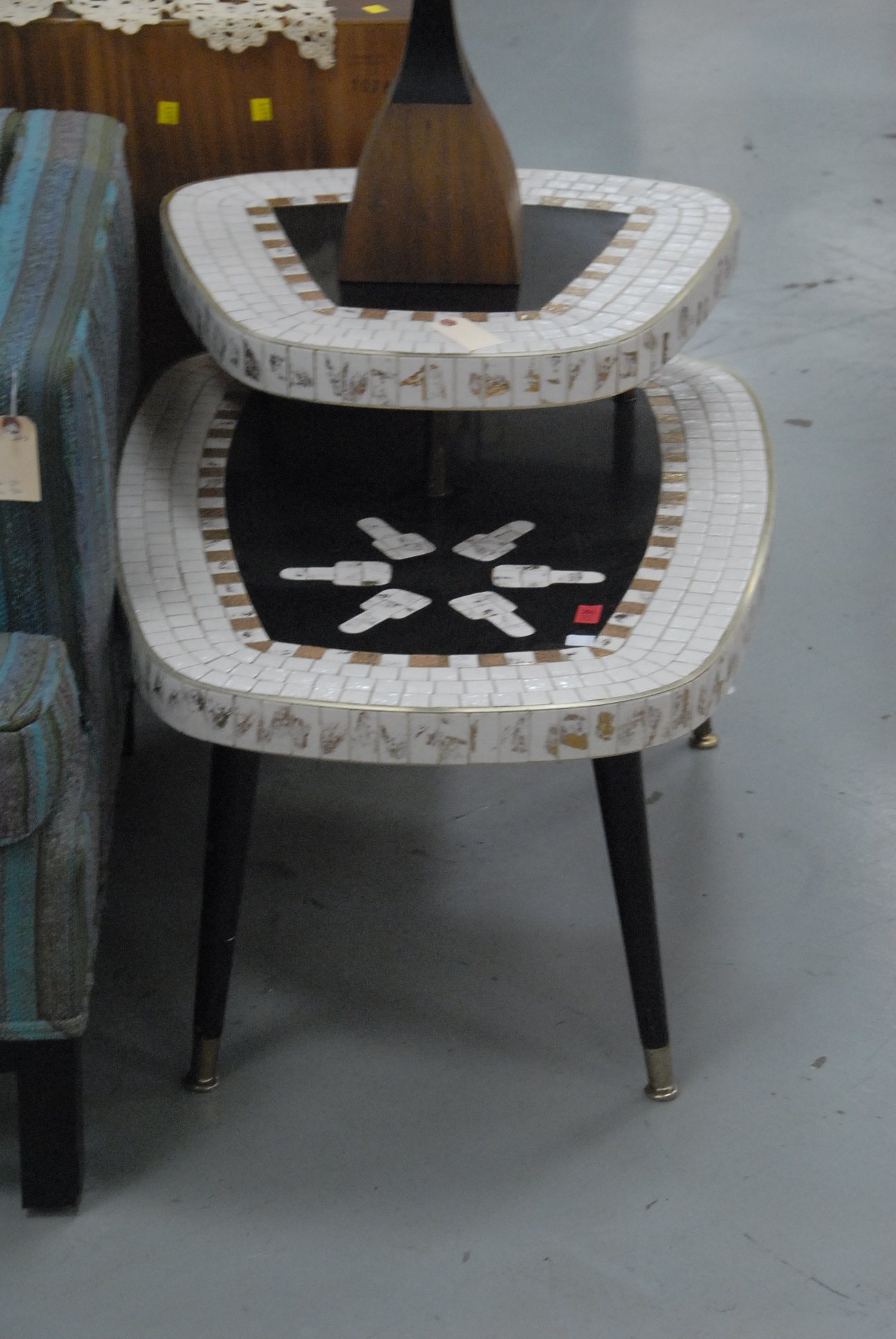 Mid-century two tier tile table with black inset panels, ht. 22 top: 23 x 31.
