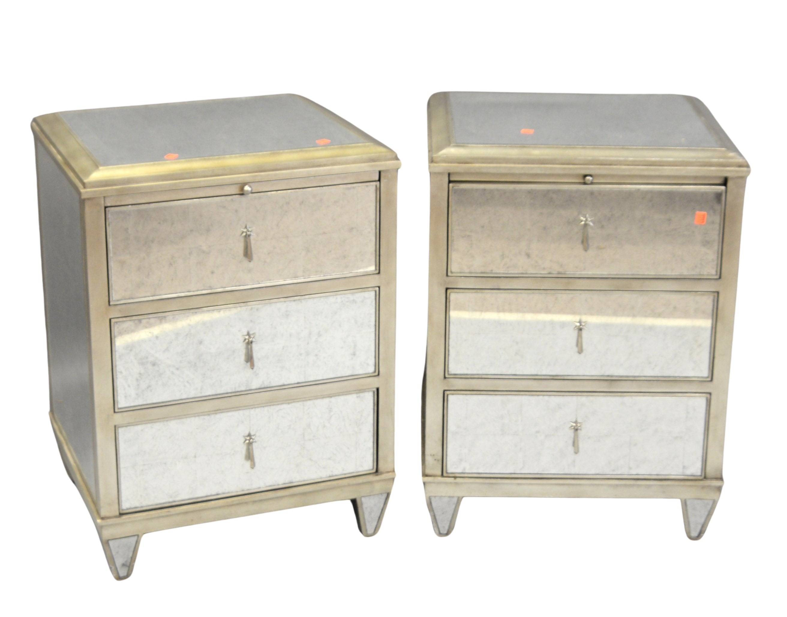 Pair Lillian August Mirrored And Silvered, three drawer stands with pull out slides, top 20″ x 22″, height 29 inches