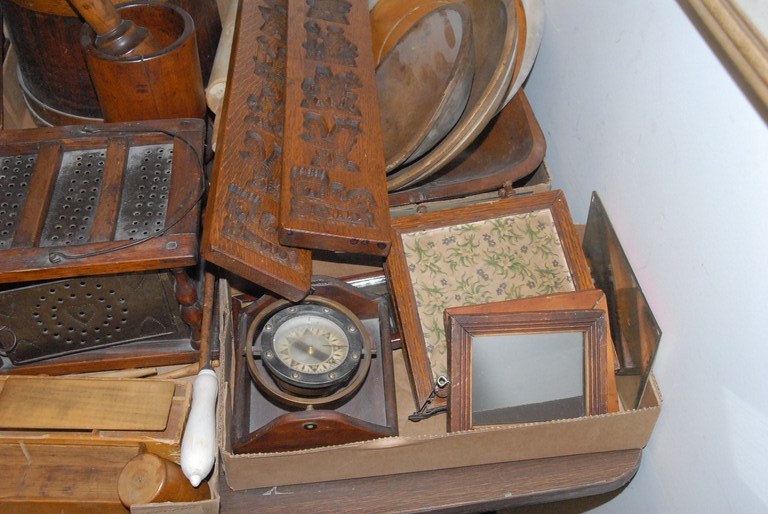 Primitive lot of five boxes foot warmer, small chest, mortar and pestle, wooden bowls and trencher, wooden molds, rolling pins, ship’s compass, double fold mirror and small primitive frames.