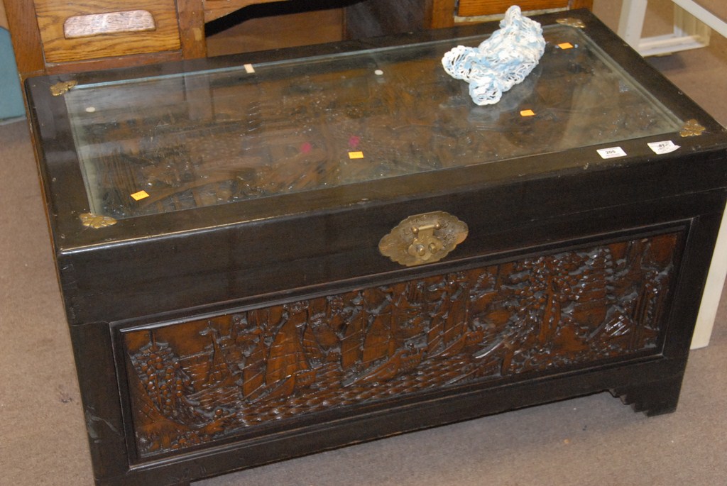 Three piece lot Chinese carved camphorwood lift top chest.